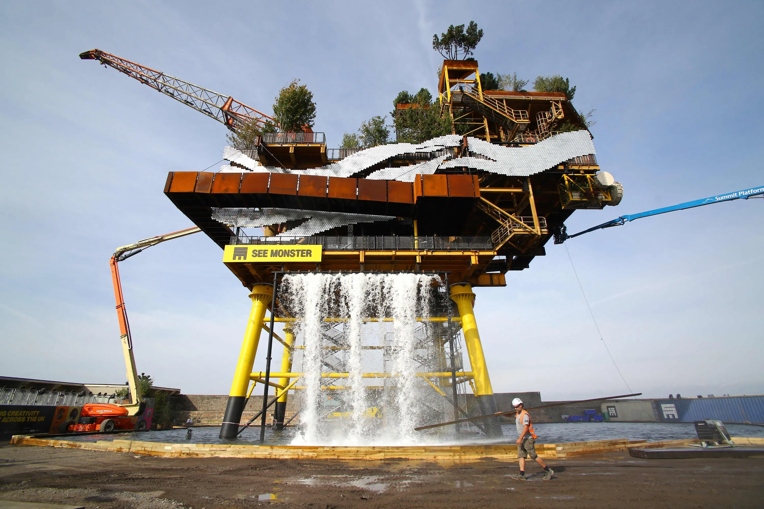 A worker walks past “See Monster”, a decommissioned North Sea offshore platform that has been transformed into a public art installation at the Tropicana on Weston-super-Mare's seafront, during a photocall on September 22, 2022. (Photo by Geoff Caddick/AFP Photo)