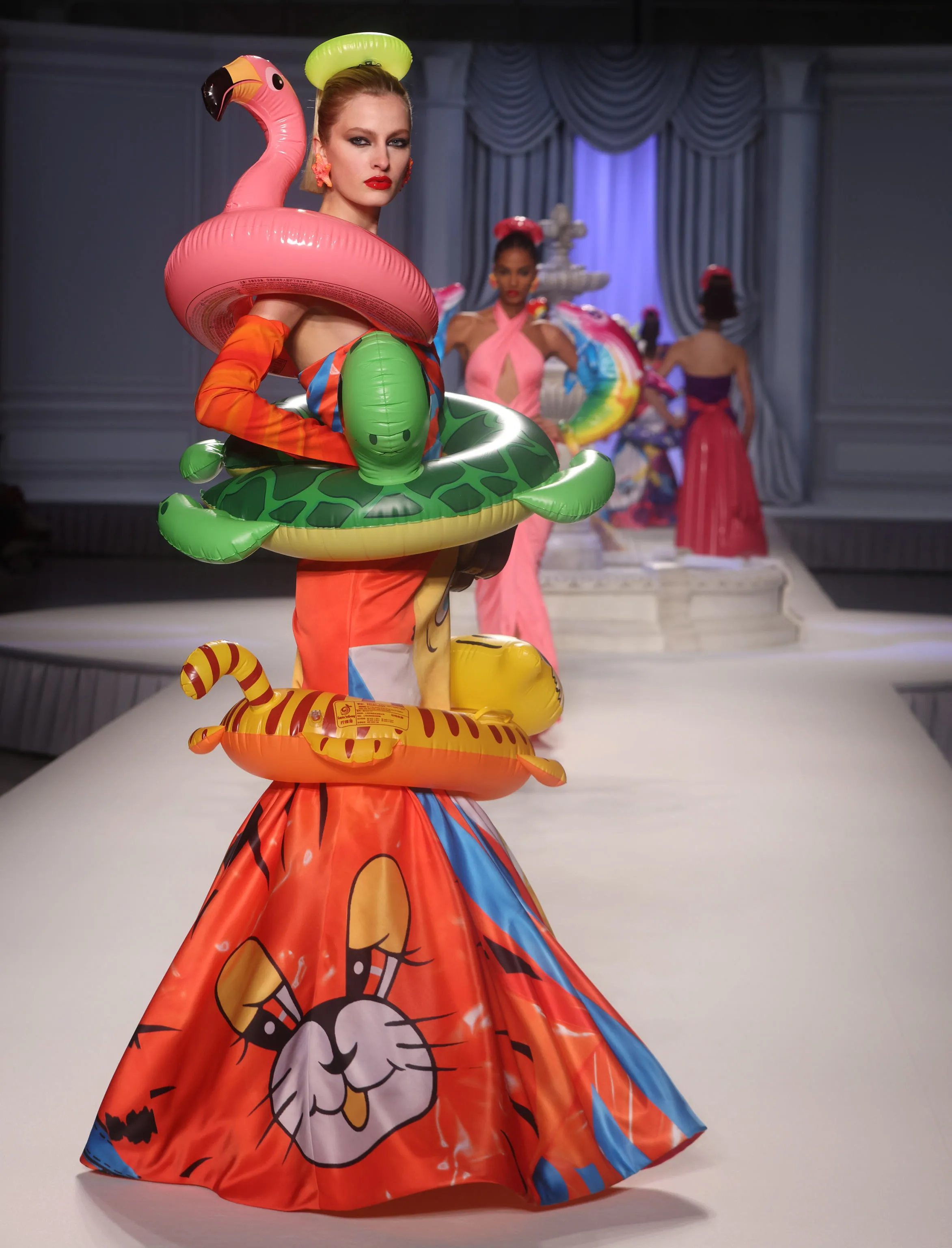 A model presents a creation by Italian label Moschino from the Spring/Summer 2023 collection during the Milan Fashion Week, in Milan, Italy, 22 September 2022. (Photo by Matteo Bazzi/EPA/EFE)