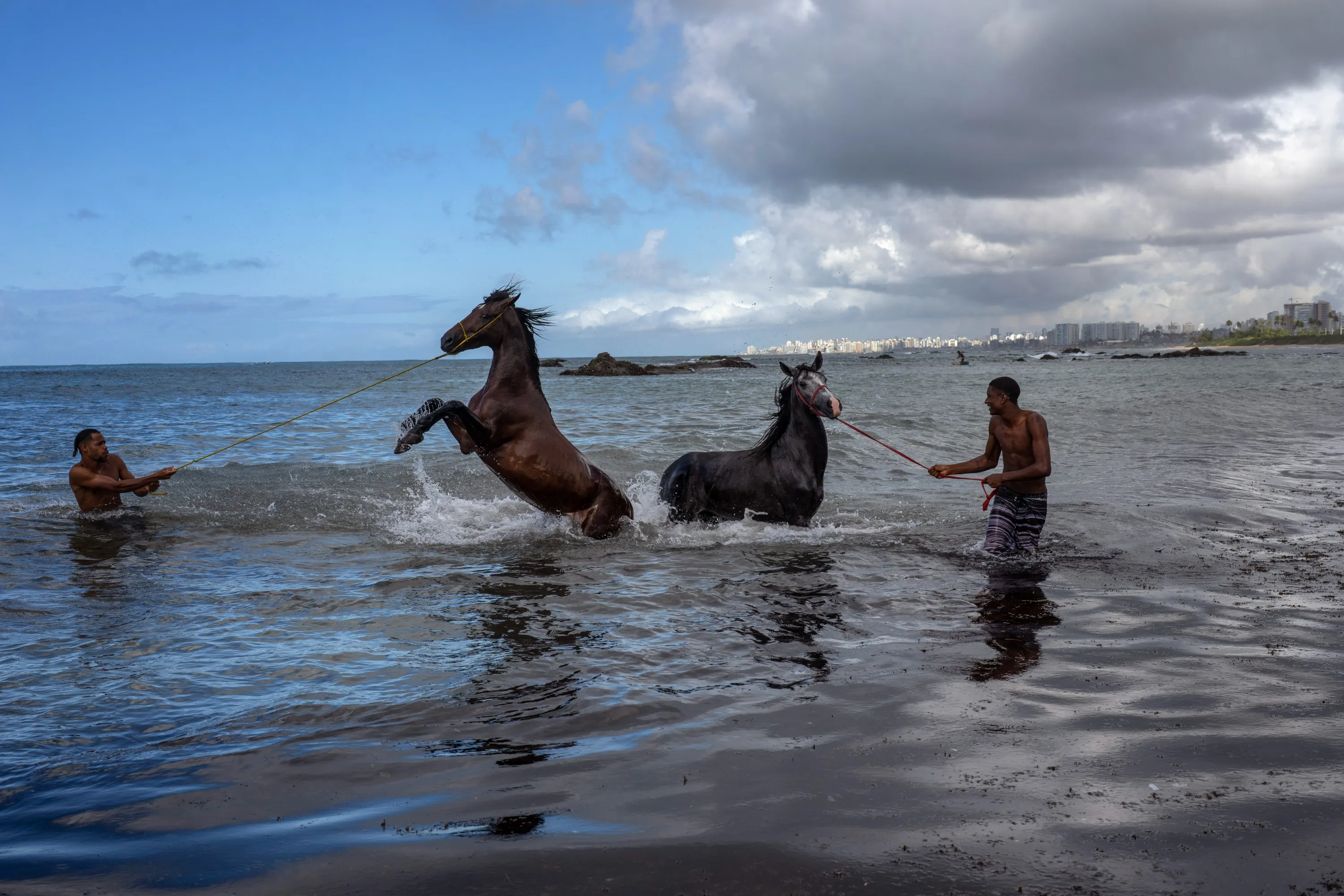 Albert Franca, right, and Ruan Gabriel wash their pet horses in the Atlantic Ocean in Salvador, Bahia state, Brazil, Thursday, September 15, 2022. The young men said they live near the ocean where they ride their horses once a month for a swim. (Photo by Rodrigo Abd/AP Photo)