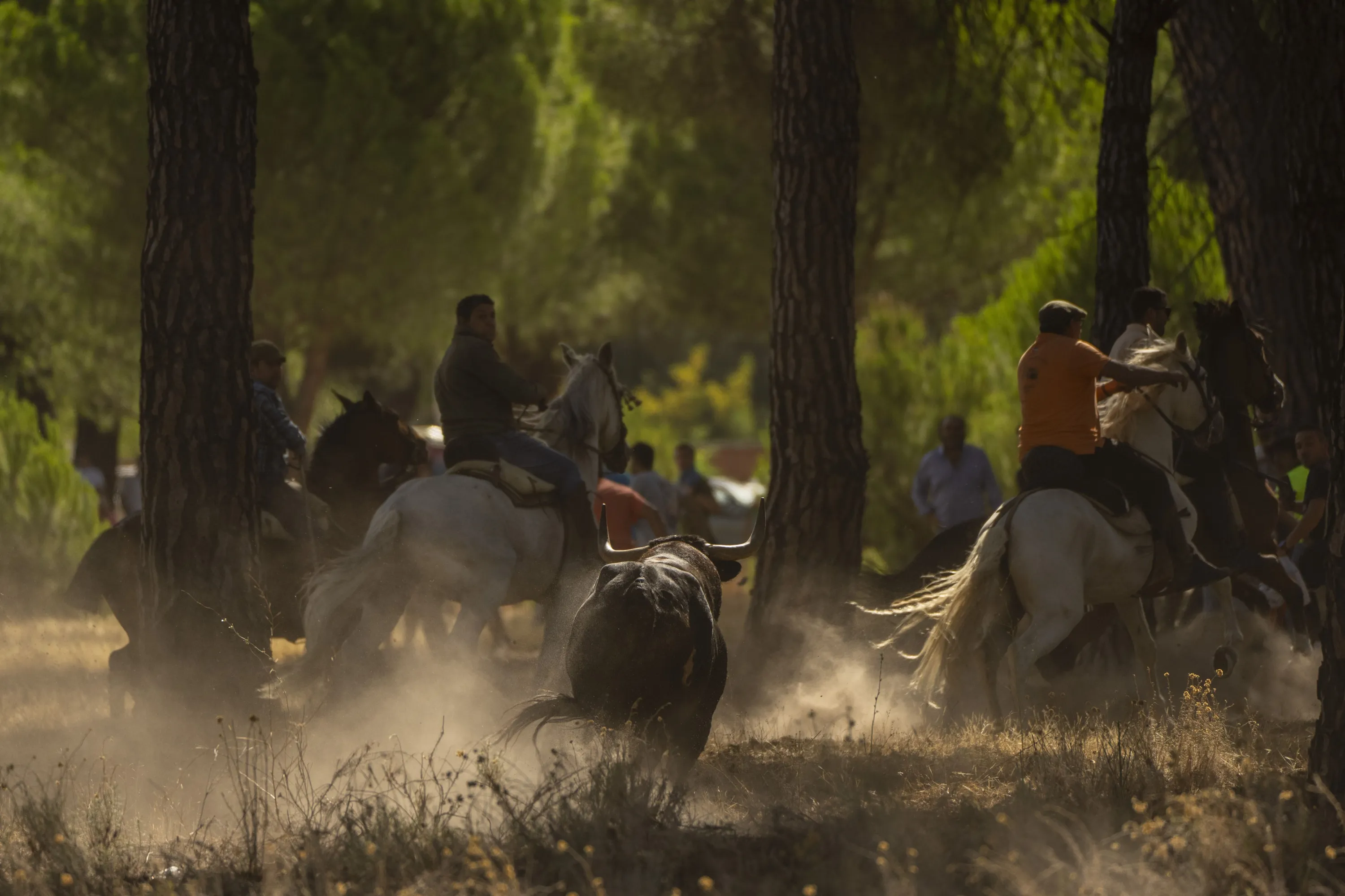 Men on horseback ride trough a pine tree forest chased by a brave bull during the “Toro de la Vega” bull festival in Tordesillas, near Valladolid, Spain, Tuesday, September 13, 2022. Hundreds of people have taken part in a centuries-old Spanish bull-chasing festival, but under orders once again that the animal should not be harmed with spears or darts. The Toro de La Vega festival in the northcentral town of Tordesillas traditionally saw the bull speared to death by revelers who chased it from the town to outlying fields on horseback and on foot. (Photo by Manu Fernandez/AP Photo)