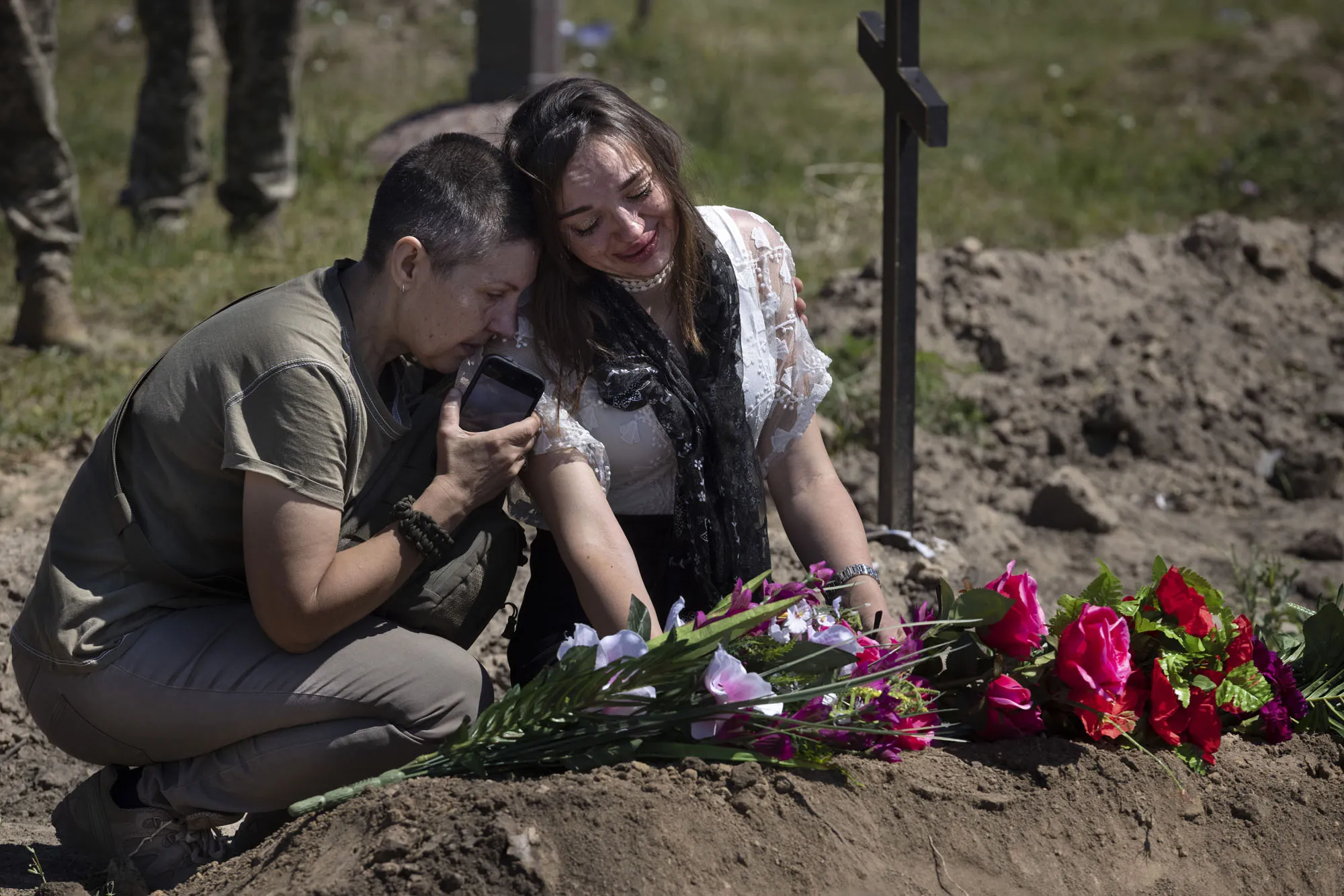 Family of Oleksander Mykytenko mourn his death at the Krasnopilske cemetery during a mass funeral for thirteen Ukrainian military on July 1, 2022 in the Dnipro, Ukraine. The weekly funeral is held to honor soldiers killed in the line of duty with many unidentified due to complications of the war and families stuck in the occupied Russian territories. The cemetery's military section has added over 300 graves since the war began. (Photo by Paula Bronstein/Getty Images)