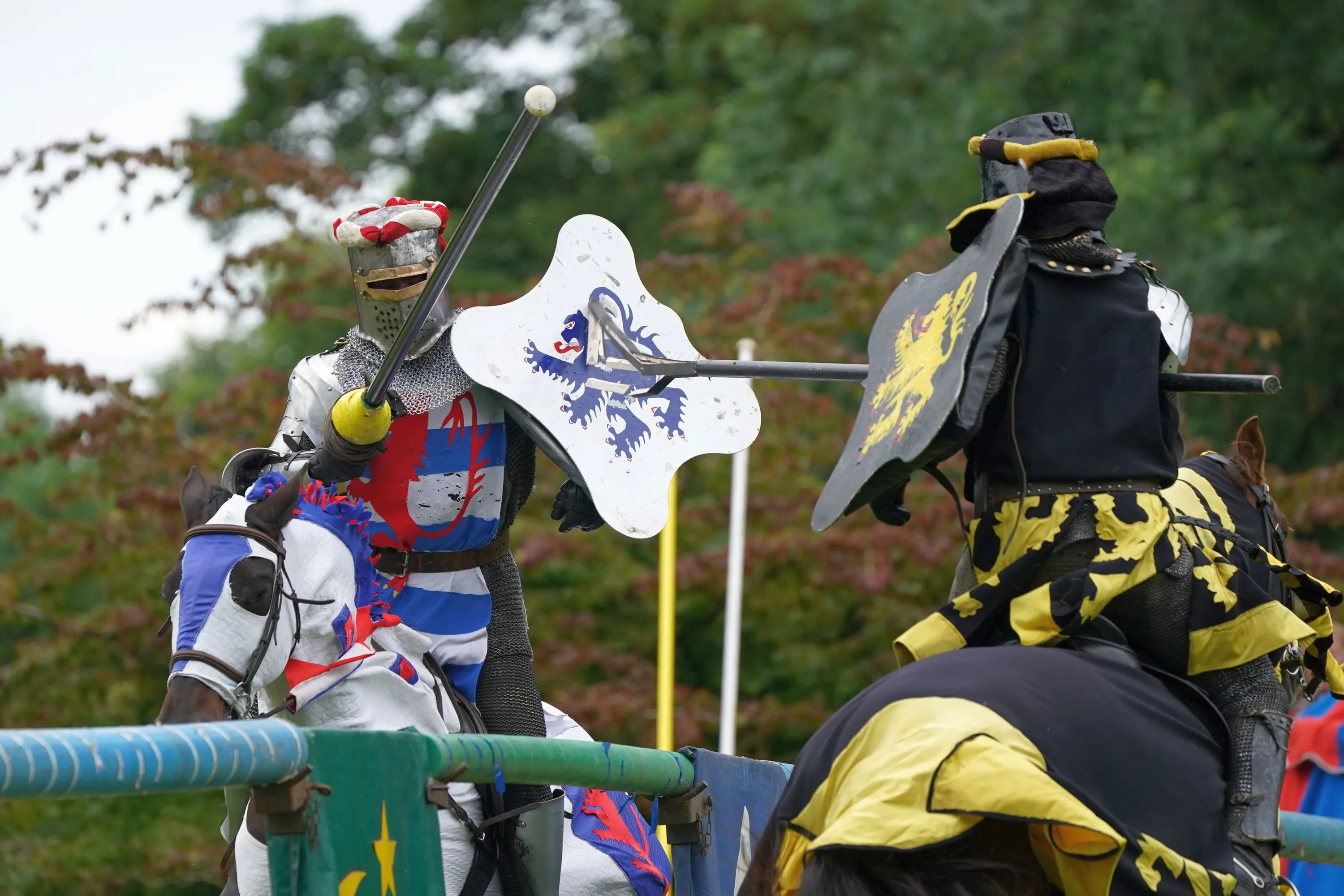 People dressed as knights of Nottingham take part in a medieval jousting display at Rockingham Castle, near Corby, Market Harborough on Sunday, June 19, 2022. (Photo by Joe Giddens/PA Wire)