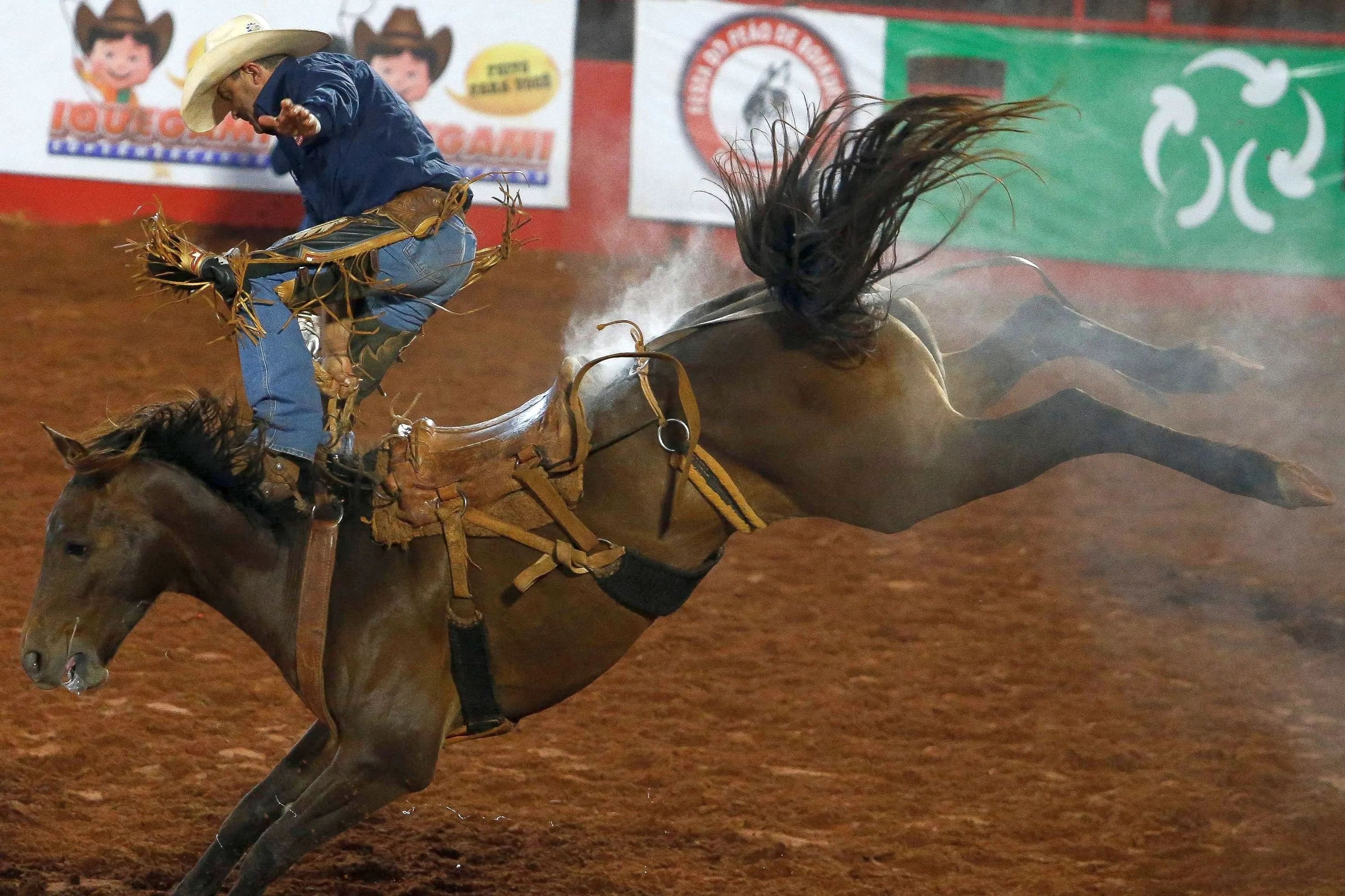 A cowboy holds onto the reins of his horse during the Festa do Peao de Barretos (Cowboy Festival of Barretos) in Barretos, Brazil, on August 26, 2022. Combining rodeo, music, religious devotion and right-wing slogans such as “God, Fatherland, Family”, the Cowboy Festival of Barretos drew thousands of spectators. (Photo by Miguel Schincariol/AFP Photo)