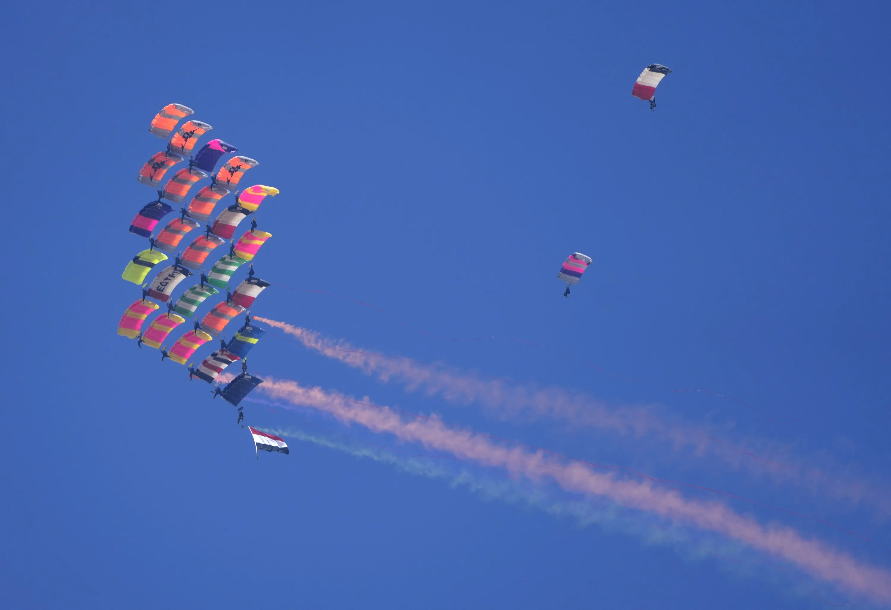 Egyptian air force “Silver Stars” aerobatic paratroopers perform at “Pyramids Airshow 2022” over the Giza Pyramids site, near Cairo, Egypt, Wednesday, Aug. 3, 2022. (Photo by Amr Nabil/AP Photo)