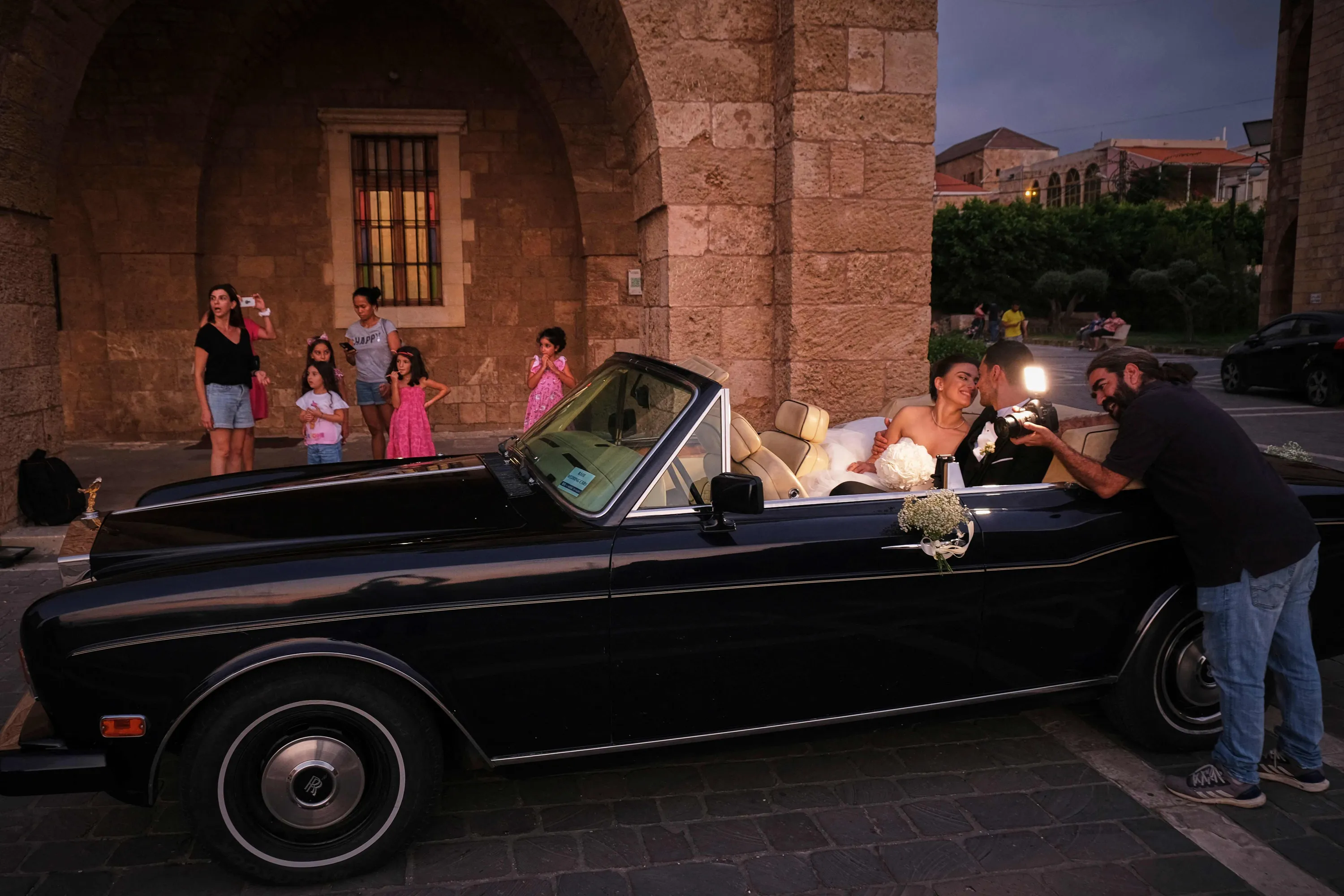 A photographer takes pictures of a newly wedded couple in a classic car, in front of the Saint Estephan Maronite church at the fishermen's port of the northern Lebanese city of Batroun, on August 6, 2022. (Photo by Ibrahim Chalhoub/AFP Photo)