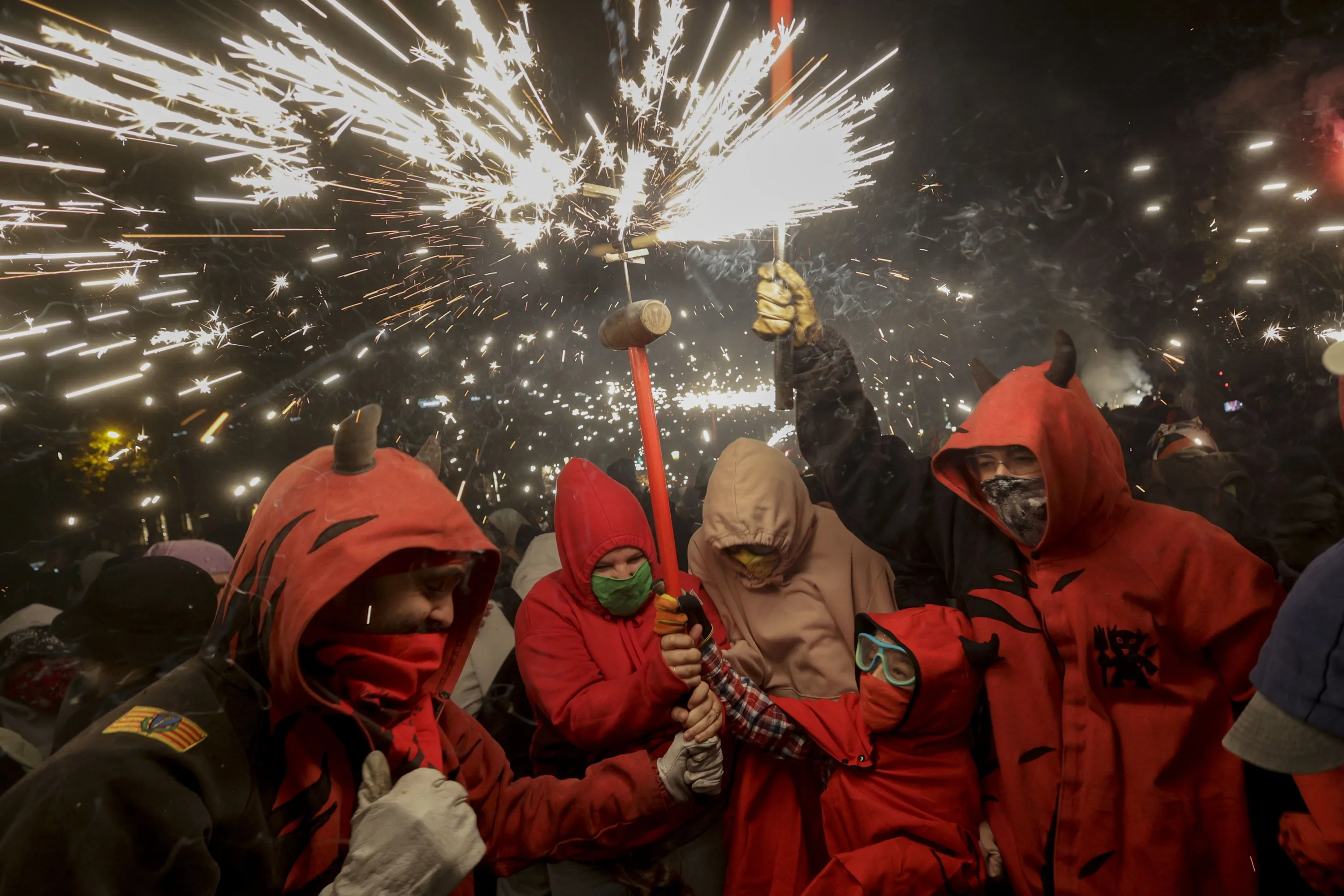 People take part in the traditional “correfoc” event held within the Merce fiestas in Barcelona, Spain, late 25 September 2022 (issued 26 September 2022). During the “correfoc” people dress as demons and run through the street as they light up fireworks. (Photo by Quique García/EPA/EFE)