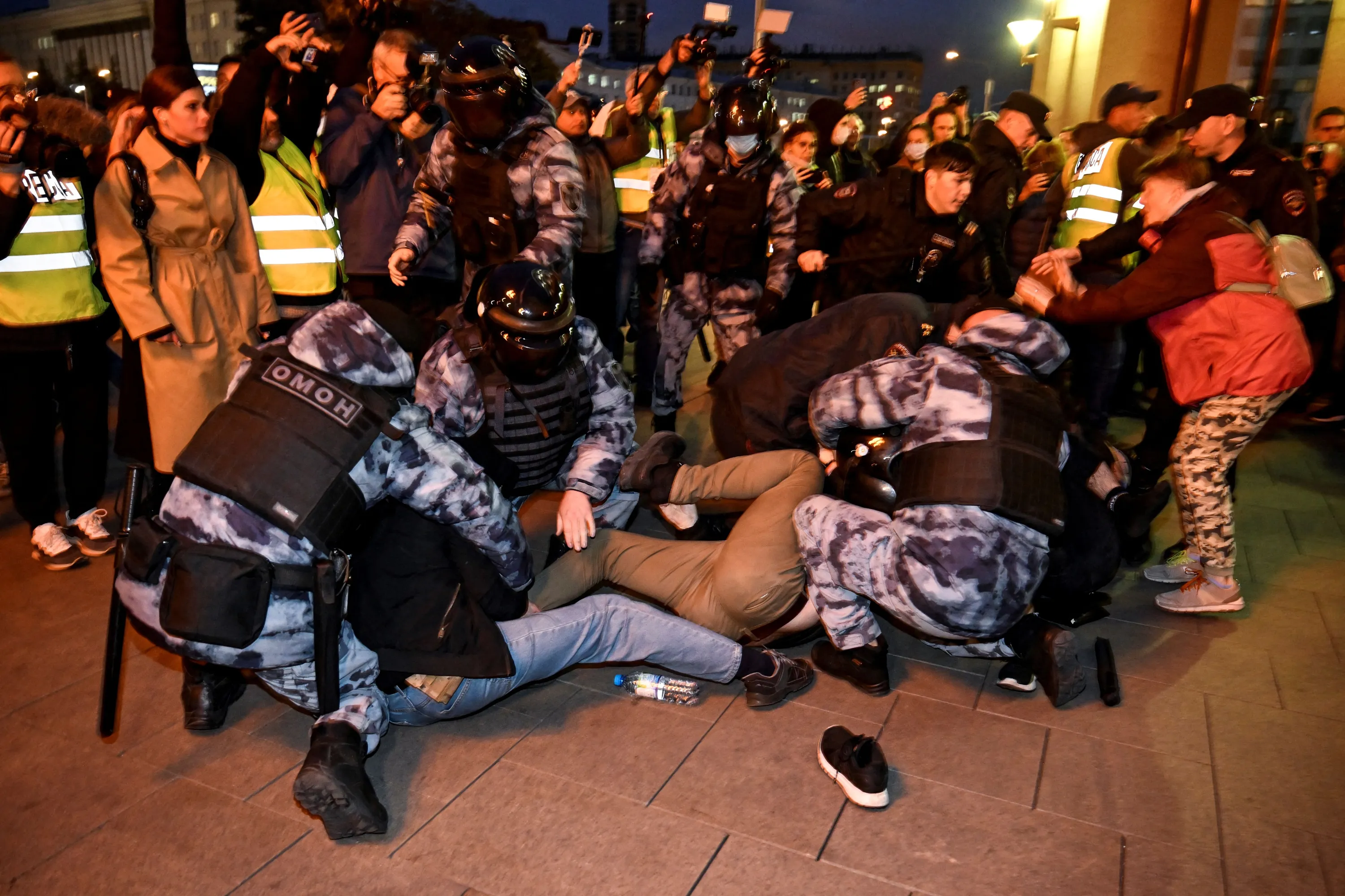 Police officers detain a man in Moscow on September 21, 2022, following calls to protest against partial mobilisation announced by President Vladimir Putin. (Photo by Alexander Nemenov/AFP Photo)