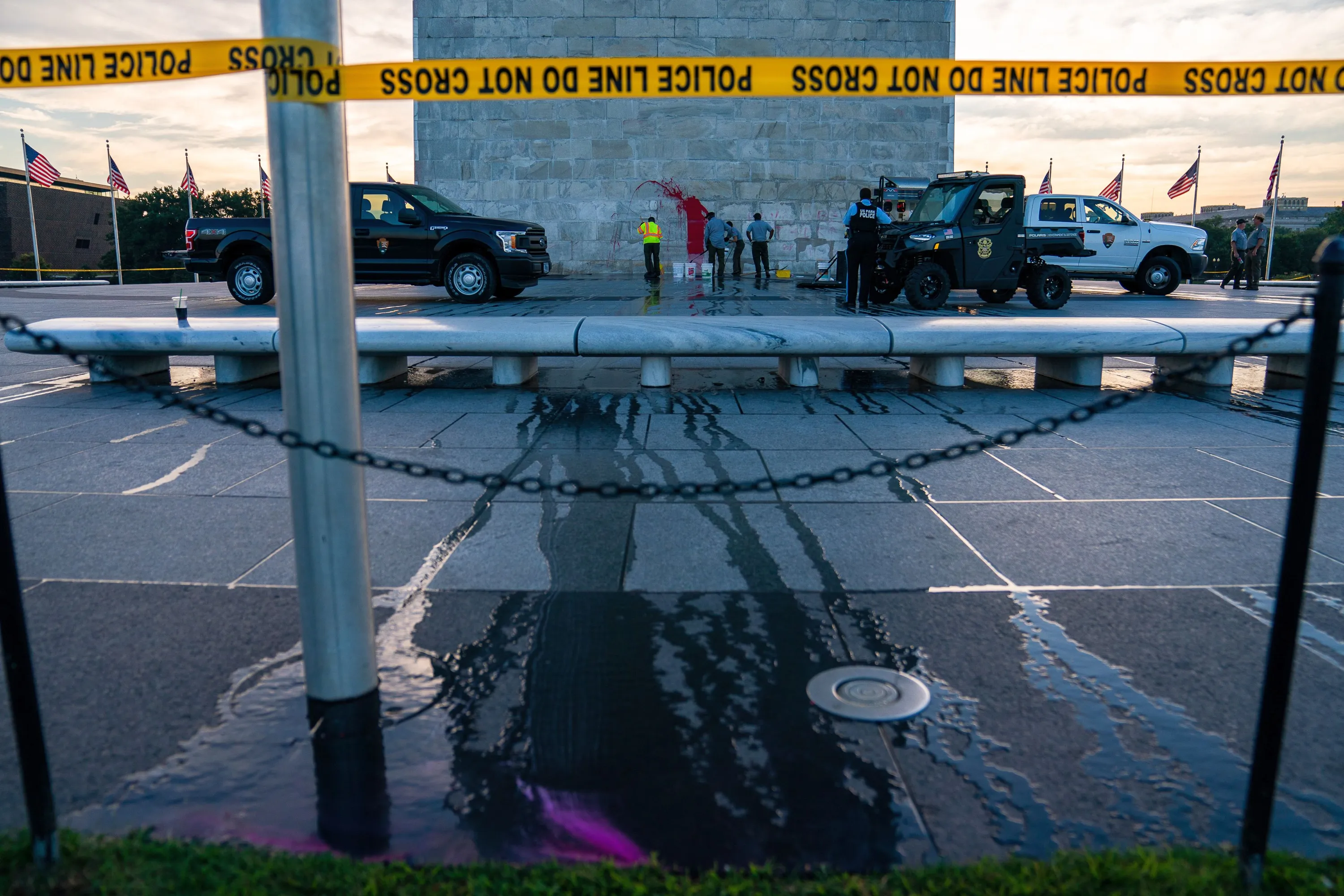 United States Parks workers clean red paint from the base of The Washington Monument on Wednesday September 21, 2022. United States Park Police say the Washington Monument is temporarily closed and a man is in custody for allegedly vandalizing the monument with paint on the evening of Tuesday, September 20.