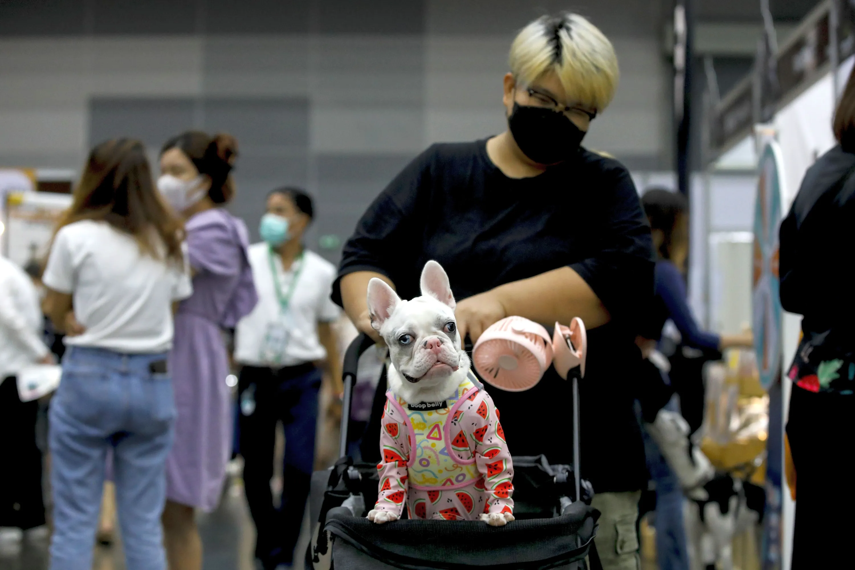A French bulldog wearing pyjamas rides on a trolley at the Pet Expo Championship 2022 in Bangkok, Thailand, 08 September 2022. The 4th Pet Expo Championship 2022, this year under the 'Mission Impossible' theme after it was suspended for 2 years due to COVID-19, aims to create business opportunities and increase revenue for exhibitors, as well as foster good attitude and basic understanding to raising pets. The expo runs from 8 to 11 September 2022. (Photo by Diego Azubel/EPA/EFE/Rex Features/Shutterstock)