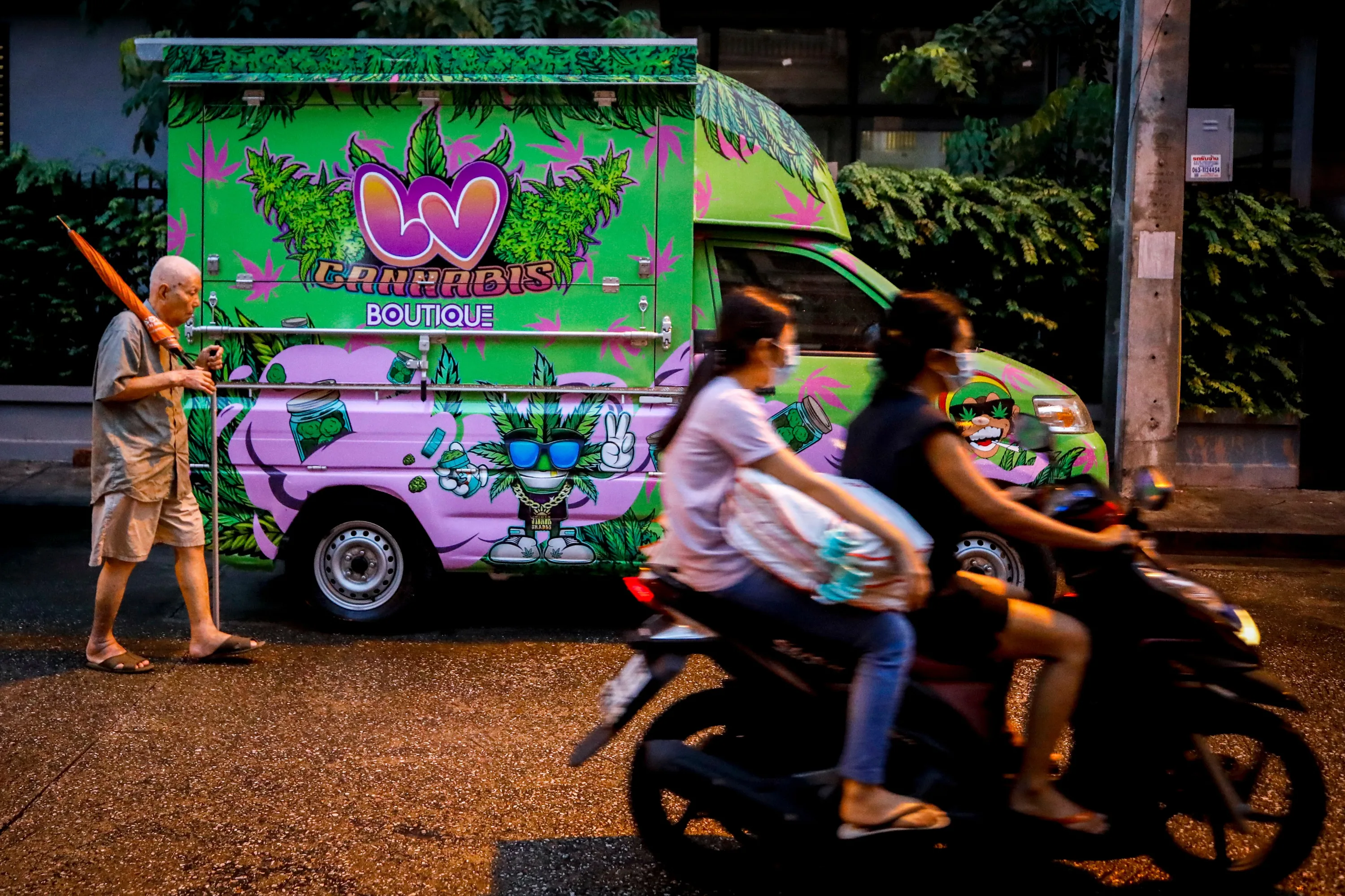 A man walks past a mobile cannabis boutique in Bangkok, Thailand, 12 September 2022. A bill on cannabis and hemp was set to be proposed to the House on 12 September, and if approved, it would potentially allow hospitals to grow cannabis for medication, and households to grow up to 15 cannabis plants intended for domestic use, and/or farm cannabis with the intention to use the roots and fibre of the plant. (Photo by Diego Azubel/EPA/EFE)