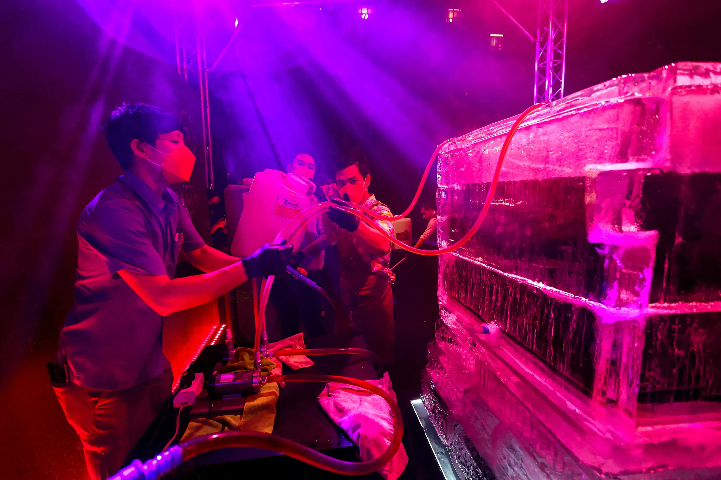 Hotel staffs pump Negroni cocktail mixture from barrels into a large container to break Guinness World Record for largest Negroni cocktail at the Kimpton Maa-Lai Bangkok Hotel, in Bangkok, Thailand on September 12, 2022. (Photo by Athit Perawongmetha/Reuters)