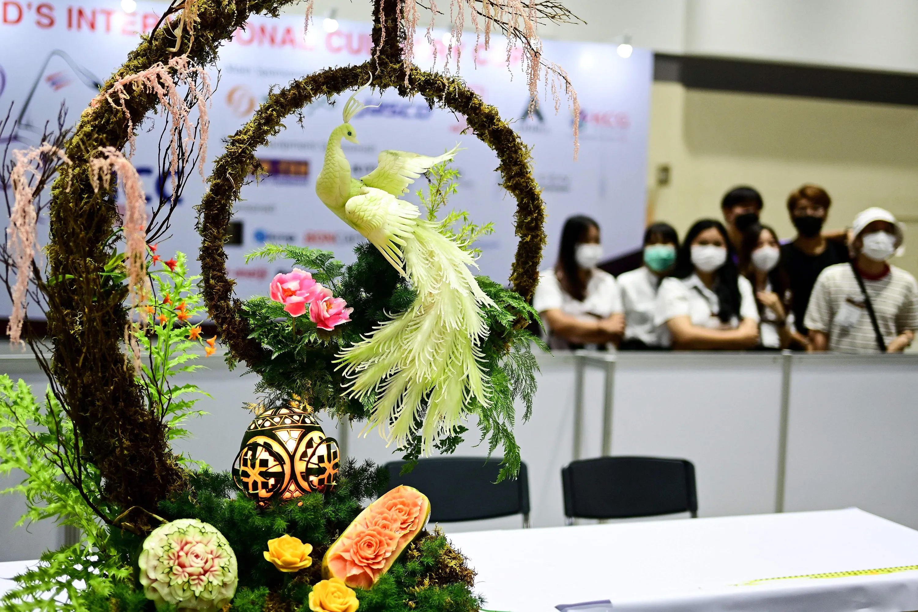 Visitors look at a carved fruits and vegetables decoration by Vietnamese participant Pham Van Dong during a fruit and vegetable carving competition at the 26th Thailand International Culinary Cup in Bangkok on September 21, 2022. (Photo by Manan Vatsyayana/AFP Photo)
