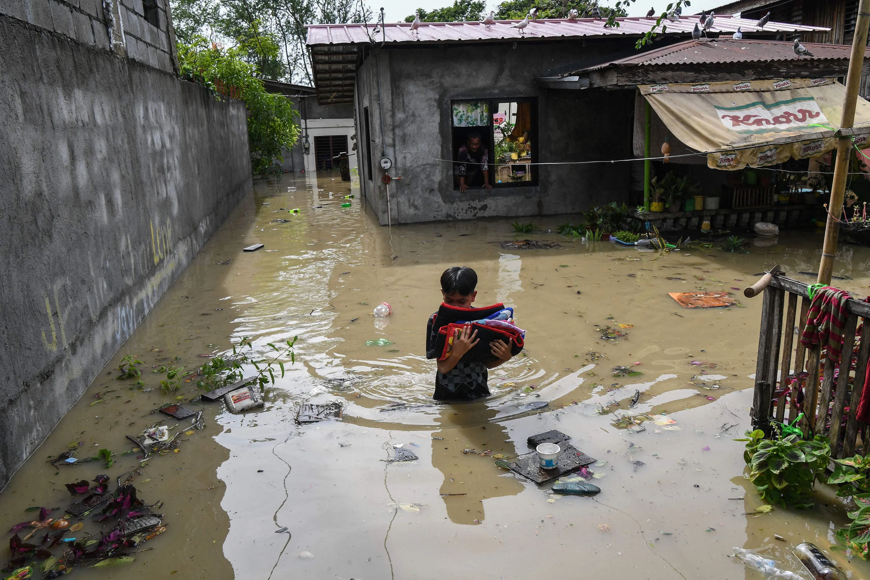A resident carries belongings while evacuating from his submerged home in the aftermath of Super Typhoon Noru in San Ildefonso, Bulacan province on September 26, 2022. (Photo by Ted Aljibe/AFP Photo)