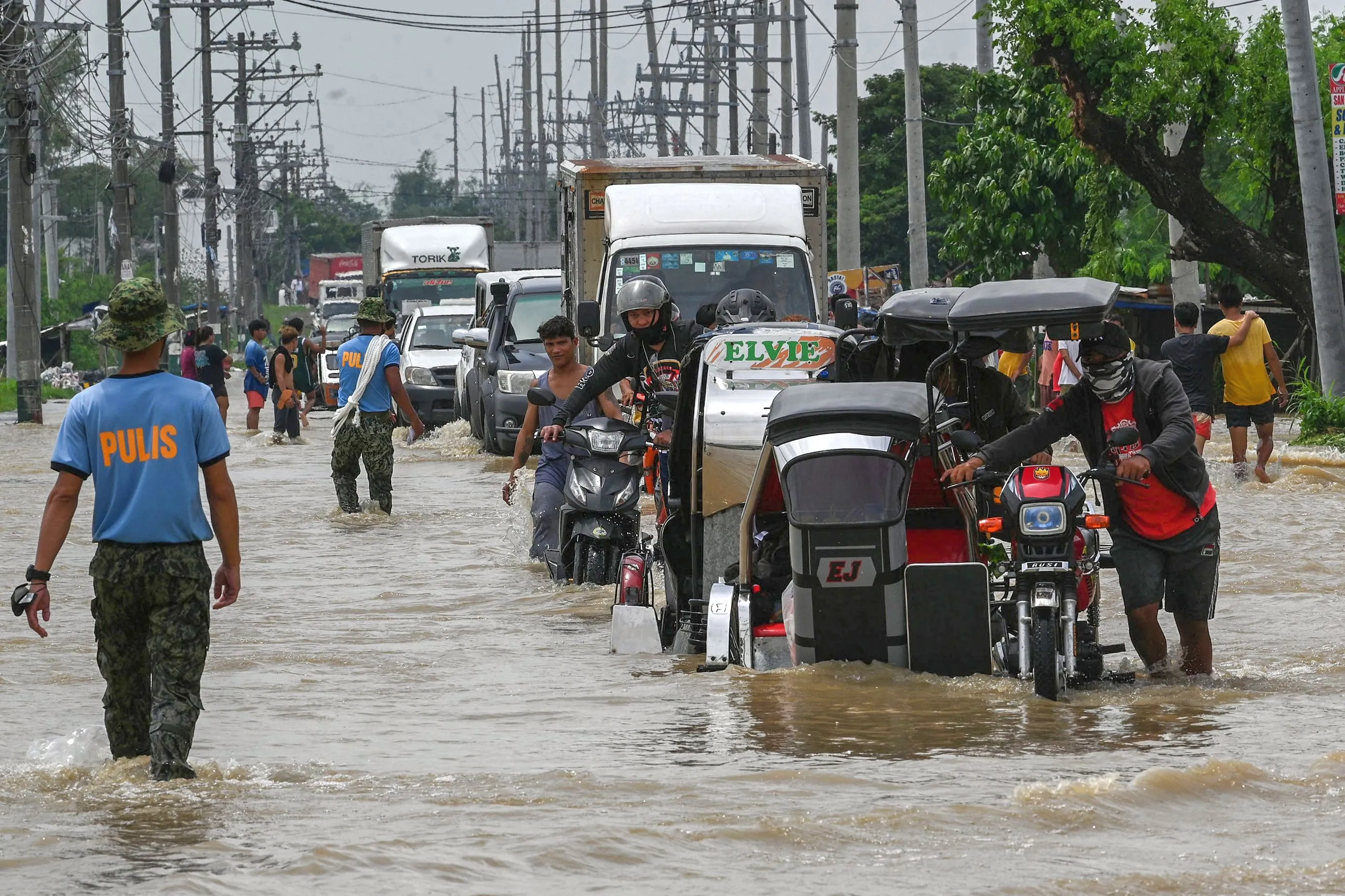 Residents and motorists commute along a flooded highway in the aftermath of Super Typhoon Noru in San Ildefonso, Bulacan province on September 26, 2022. (Photo by Ted Aljibe/AFP Photo)