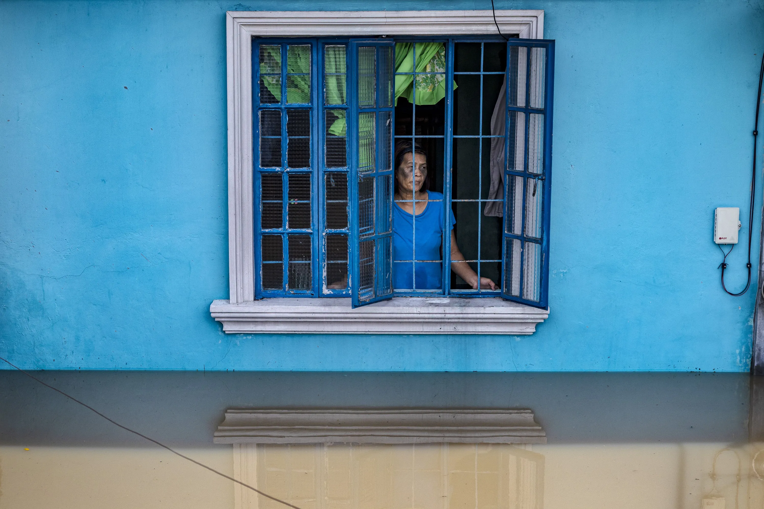 A woman looks out from her home, which was flooded by Super Typhoon Noru on September 26, 2022 in San Ildefonso, Bulacan province, Philippines. Super Typhoon Noru made landfall in the Philippines overnight, causing widespread flooding and leaving at least five dead. High winds and heavy rains have flattened villages and have increased the threat of landslides. (Photo by Ezra Acayan/Getty Images)