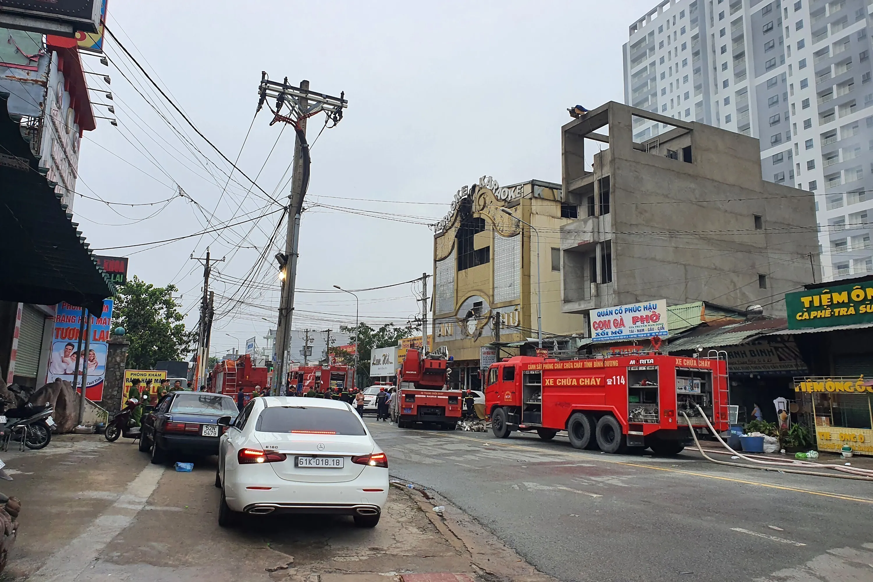 Fire department trucks line outside a karaoke parlor following a fire Wednesday, September 7, 2022, in Thuan An city, southern Vietnam. Over a dozen people died in the fire local media reported. (Photo by Duong Trei Tuong/VNA via AP Photo)