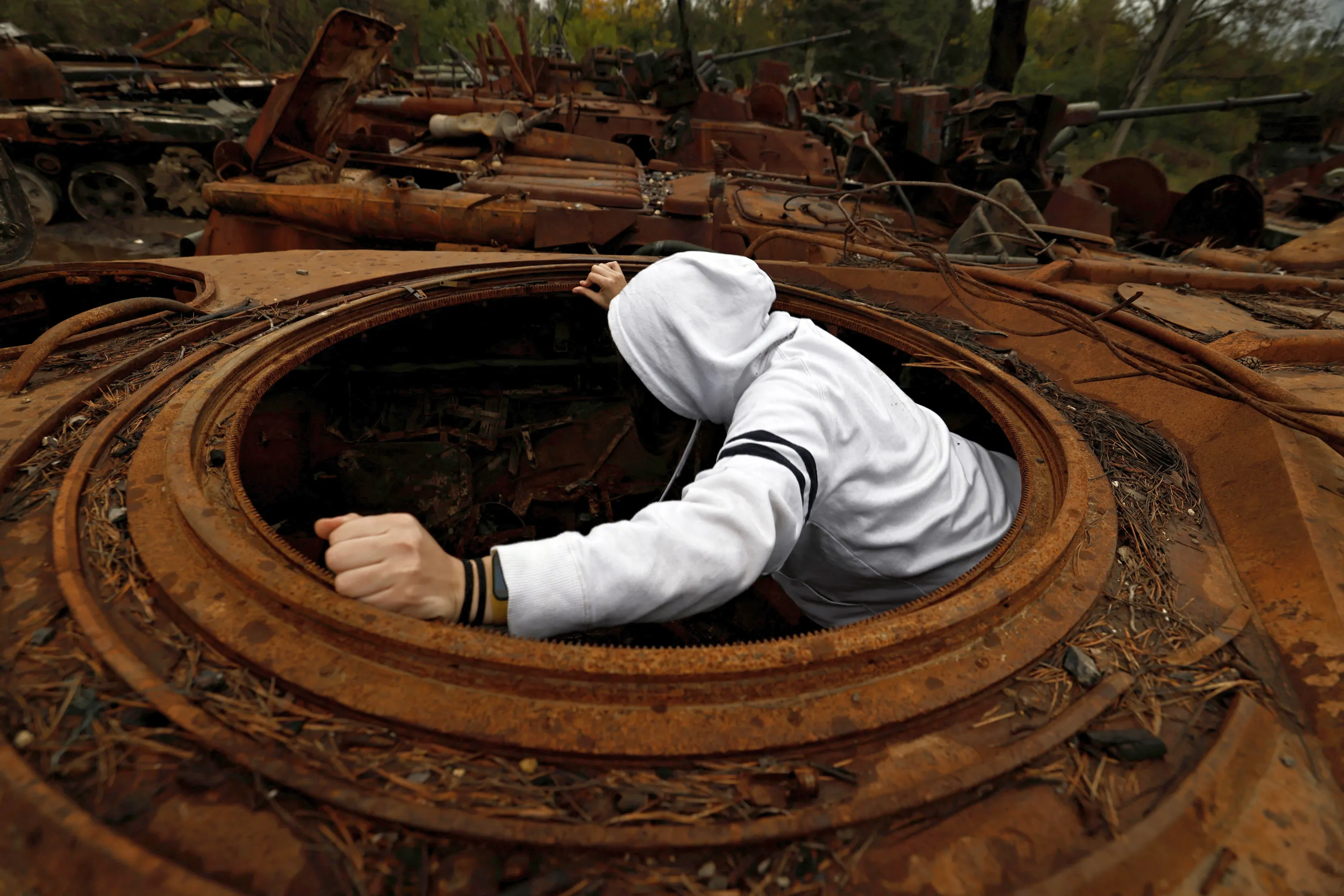 Anna Sachek, 18, a volunteer, who said she is collecting souvenirs, crawls inside a destroyed Russian armoured vehicle, in the recently liberated town of Izium, in Ukraine's Kharkiv region on September 27, 2022. (Photo by Zohra Bensemra/Reuters)