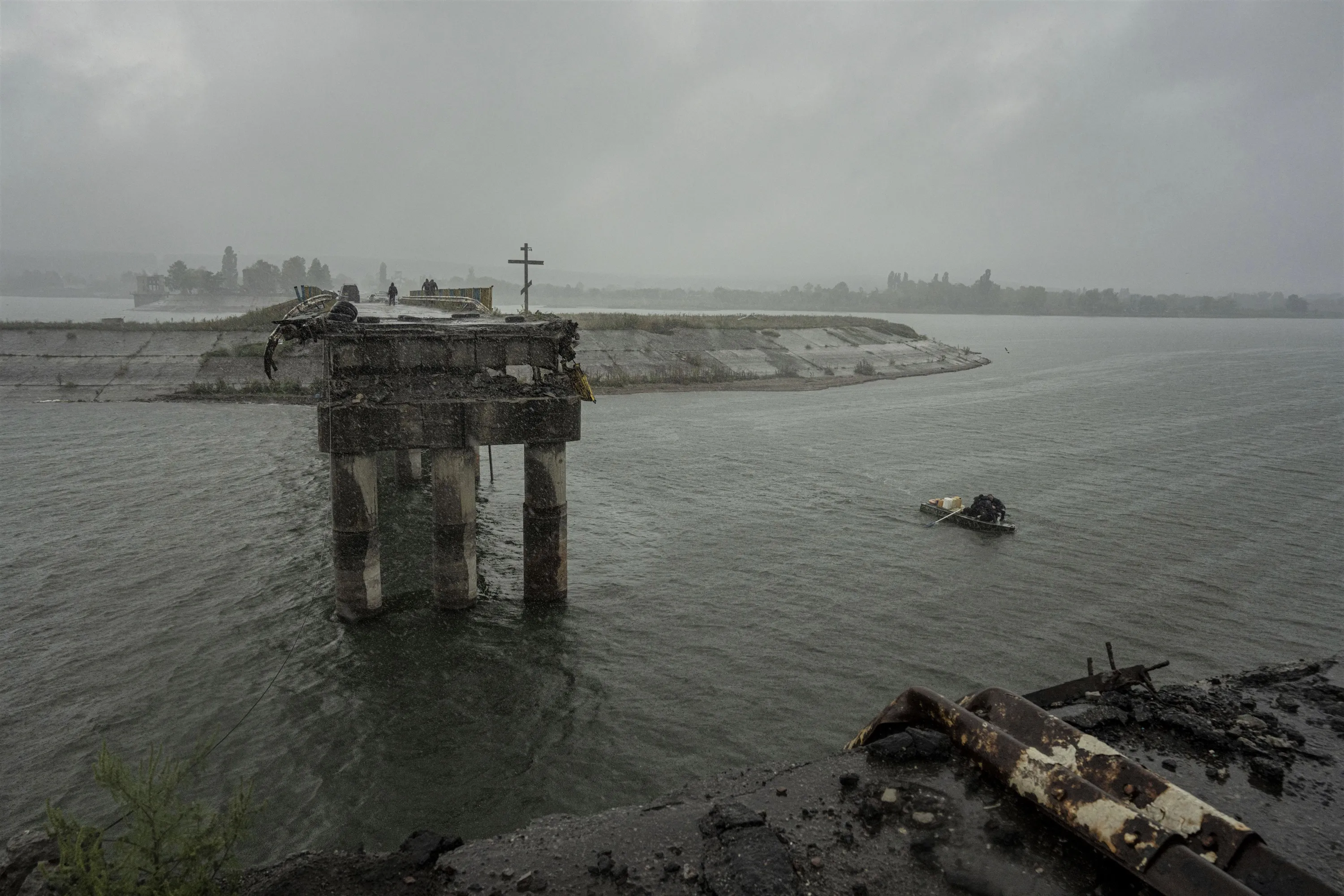 People transport fuel on a boat in front of a destroyed bridge across the Siverskyi-Donets river in Staryi-Saltiv, Ukraine, Tuesday, September 27, 2022. (Photo by Evgeniy Maloletka/AP Photo)