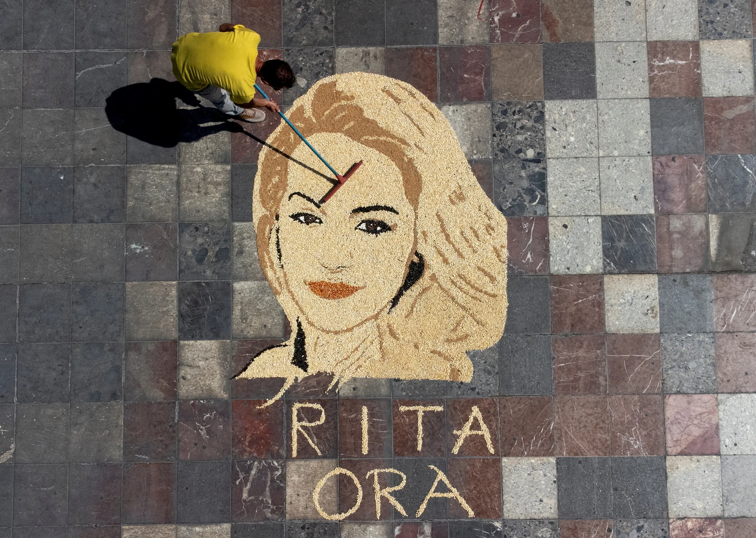 Kosovo artist Alkent Pozhegu works on the final touches of British singer Rita Ora portrait made with wheat, rice, sunflower seeds, corn, lentils in Tirana, Albania on September 6, 2022. (Photo by Florion Goga/Reuters)