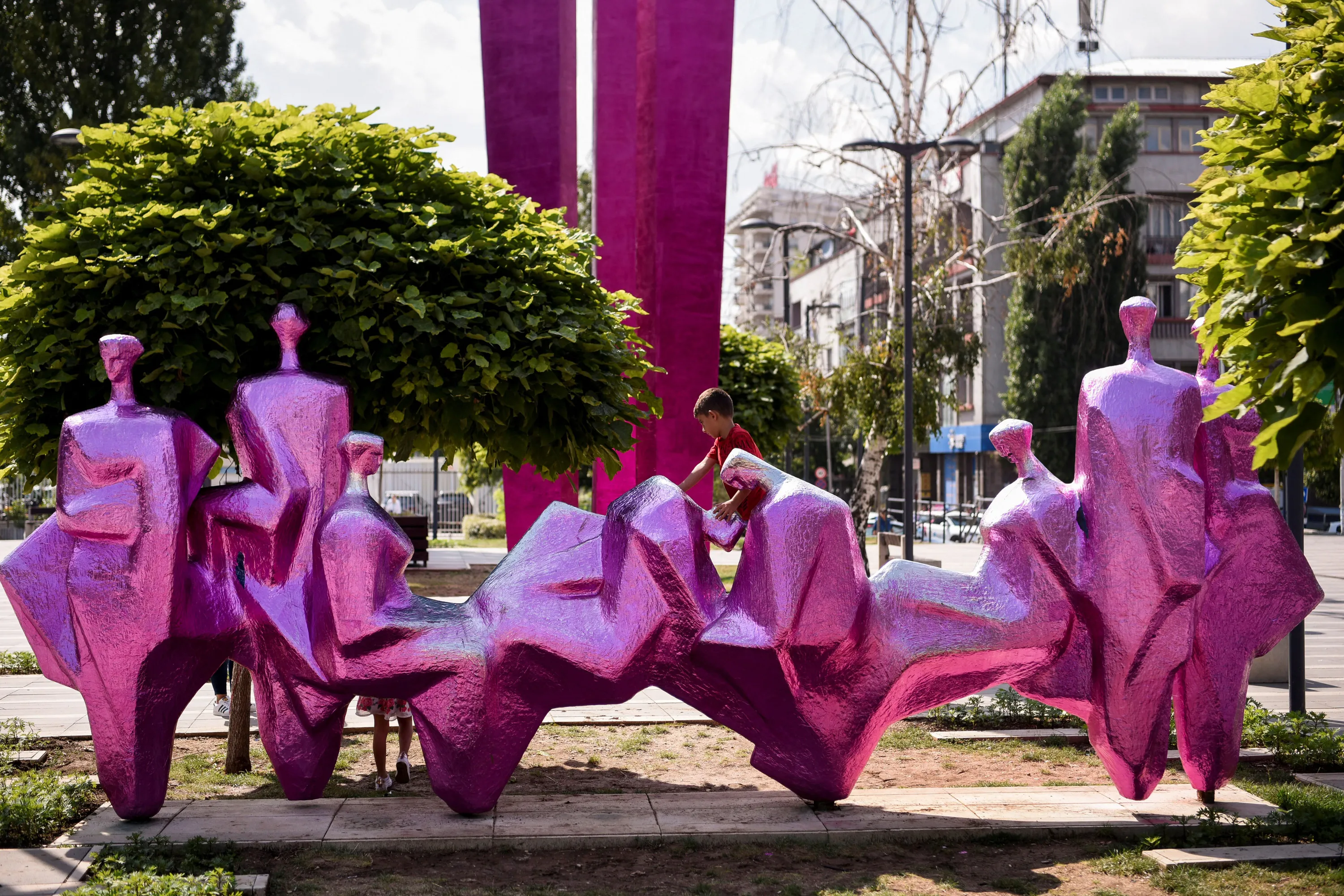 A child plays at the Yugoslav era monument called “The Monument of Brotherhood and Unity” wrapped in aluminum foil as part of an artistic intervention of Swiss artist Ugo Rondinone for the European Nomadic Biennial on August 15, 2022 in Pristina, Kosovo. (Photo by Armend Nimani/AFP Photo)