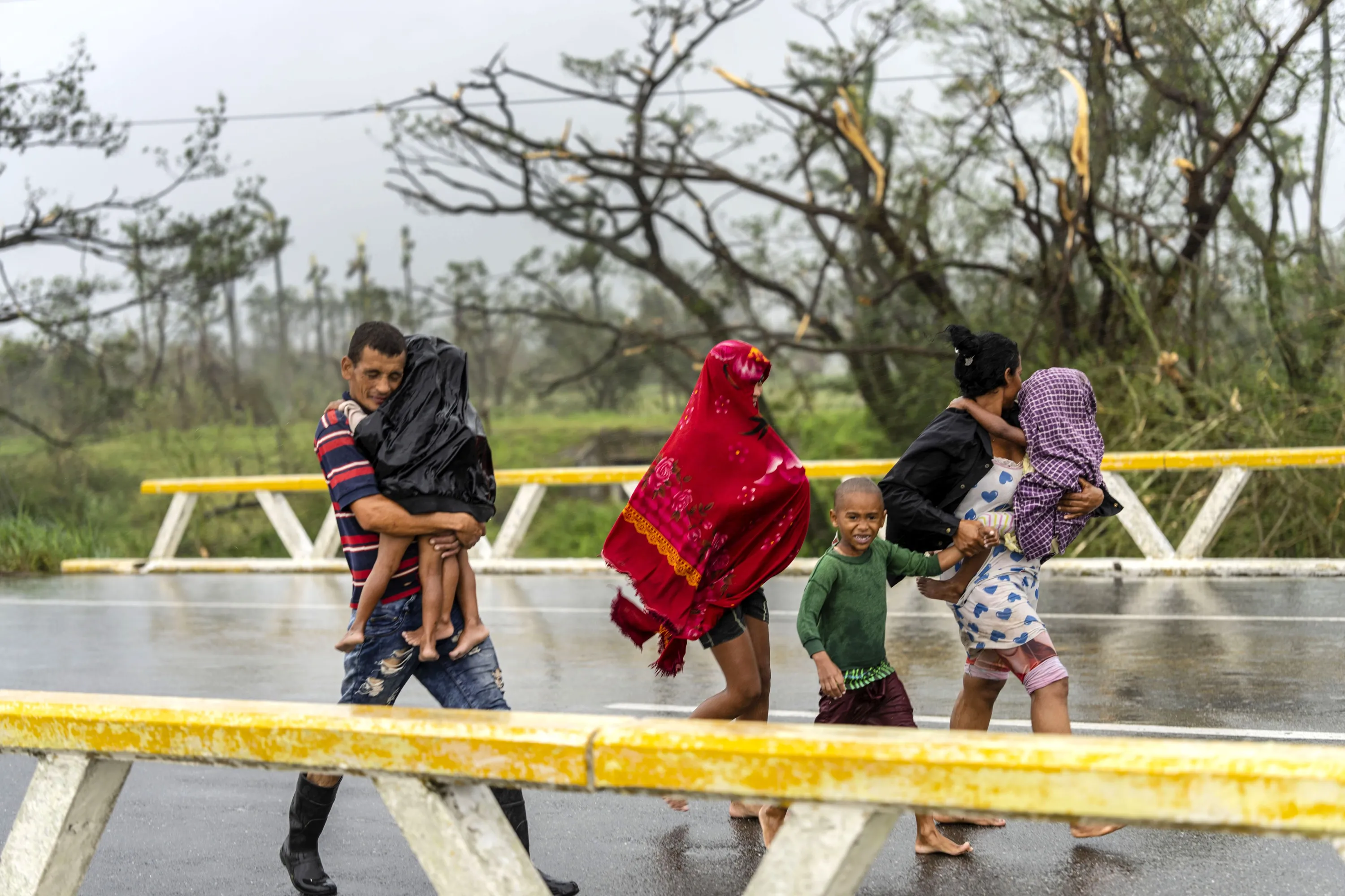 A family walks in the rain after Hurricane Ian hit Pinar del Rio, Cuba, Tuesday, September 27, 2022. Ian made landfall at 4:30 a.m. EDT Tuesday in Cuba’s Pinar del Rio province, where officials set up shelters, evacuated people, rushed in emergency personnel and took steps to protect crops in the nation’s main tobacco-growing region. (Photo by Ramon Espinosa/AP Photo)