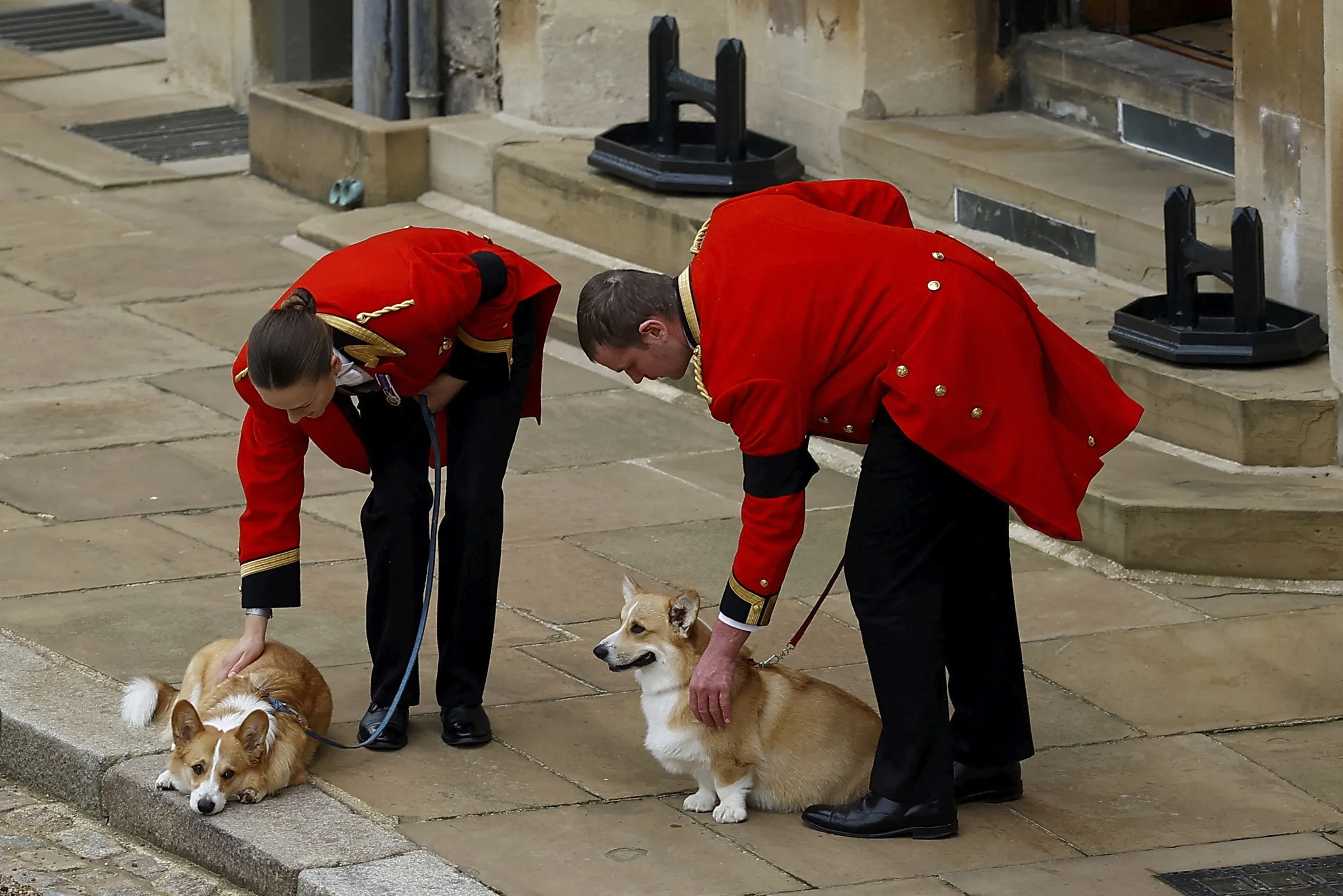 The royal corgis await the cortege on the day of the state funeral and burial of Britain's Queen Elizabeth, at Windsor Castle, Monday September 19, 2022. (Photo by Peter Nicholls/Pool Photo via AP Photo)