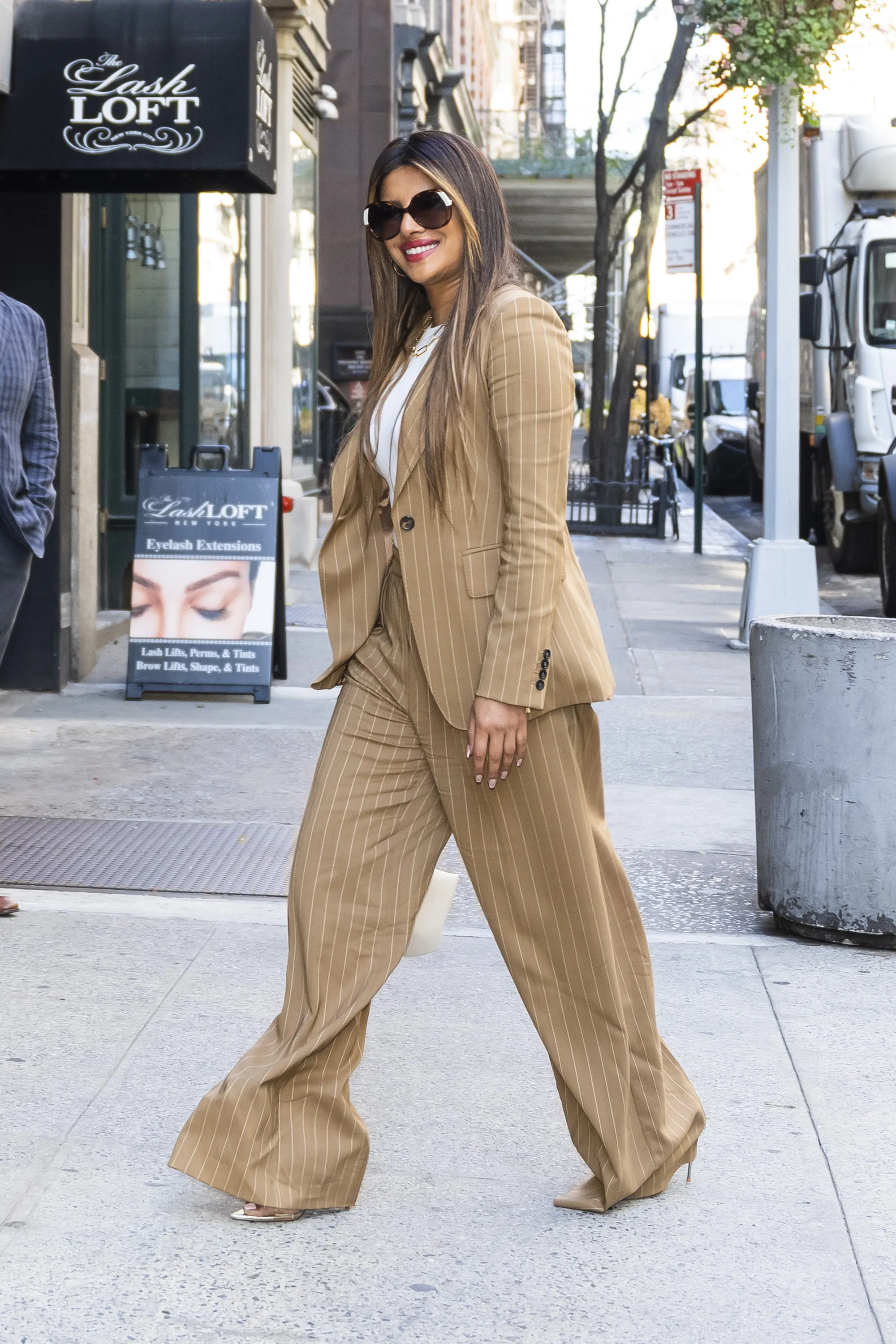 Priyanka Chopra is pictured heading to her restaurant, Sona for lunch in New York City on September 21, 2022. The 40 year old Indian actress looked stylish is a tan striped blazer, matching trousers, white blouse, and heels. (Photo by The Image Direct)