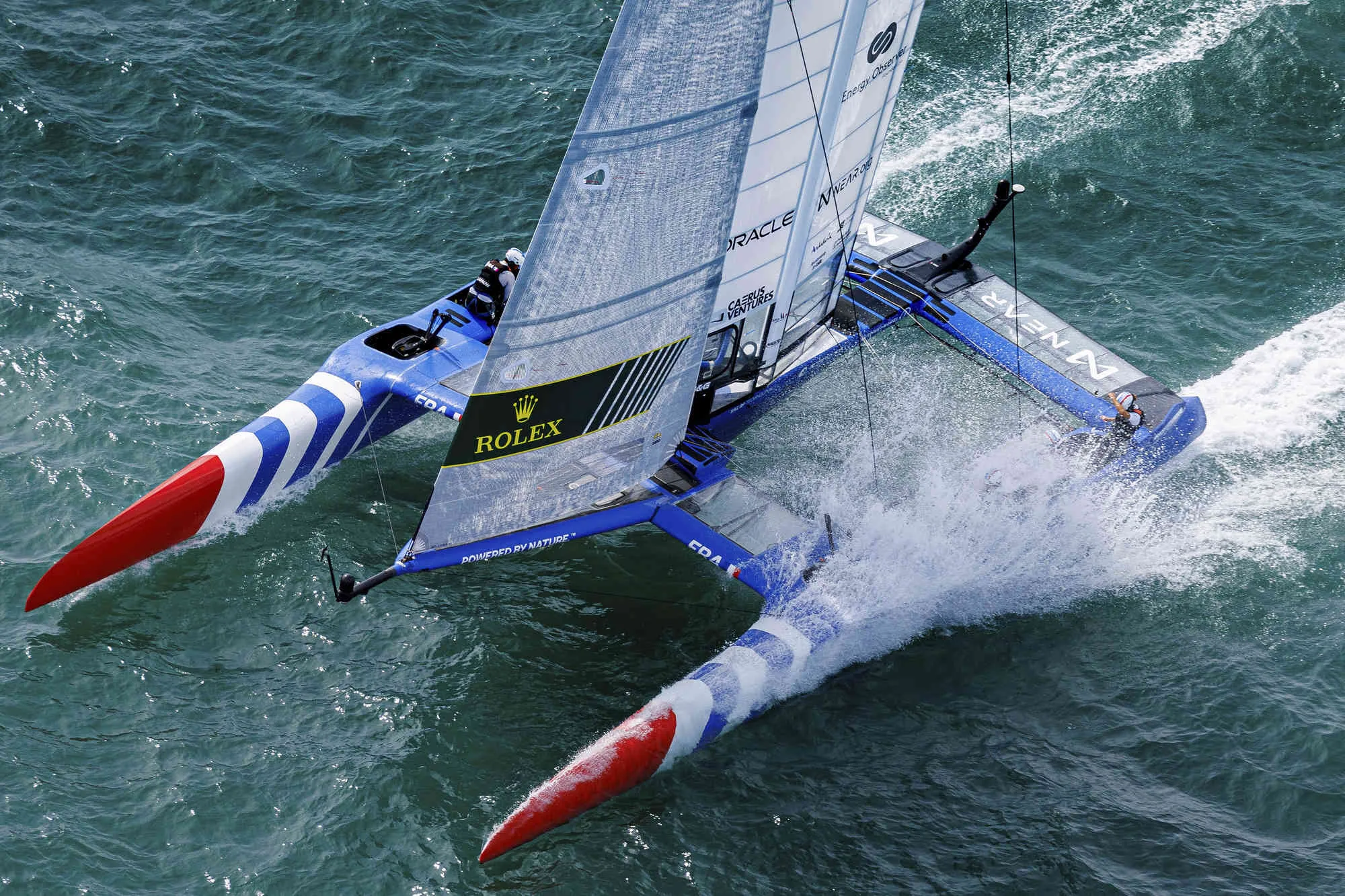In this photo provided by SailGP, the France SailGP Team, helmed by Quentin Delapierre, sail their way to victory as they win their first ever SailGP event at the Spain Sail Grand Prix in Cadiz, Andalusia, Spain, Sunday, September 25, 2022. (Photo by David Gray/SailGP via AP Photo)
