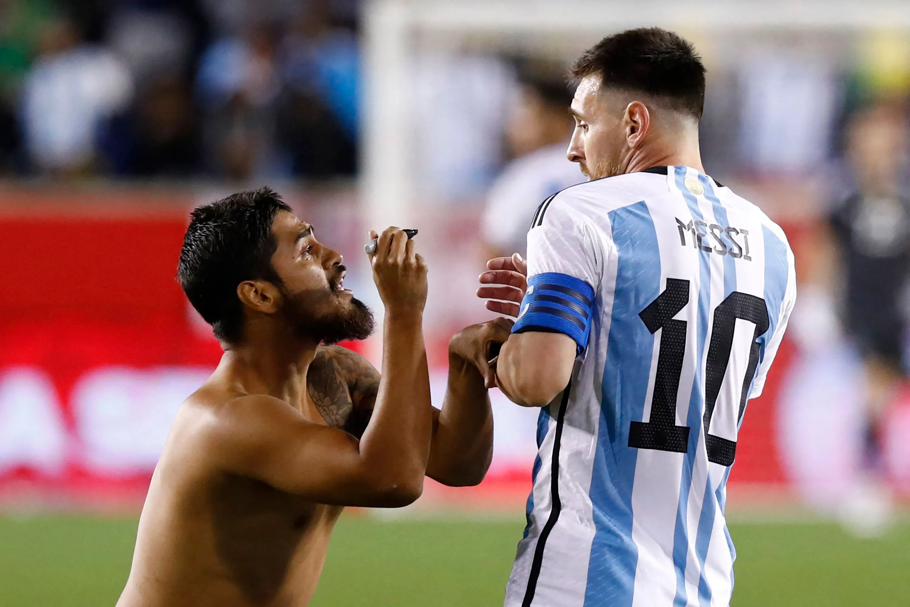 Argentina's Lionel Messi reacts as a fan ran on the pitch to ask for his autograh during the international friendly football match between Argentina and Jamaica at Red Bull Arena in Harrison, New Jersey, on September 27, 2022. (Photo by Andres Kudacki/AFP Photo)
