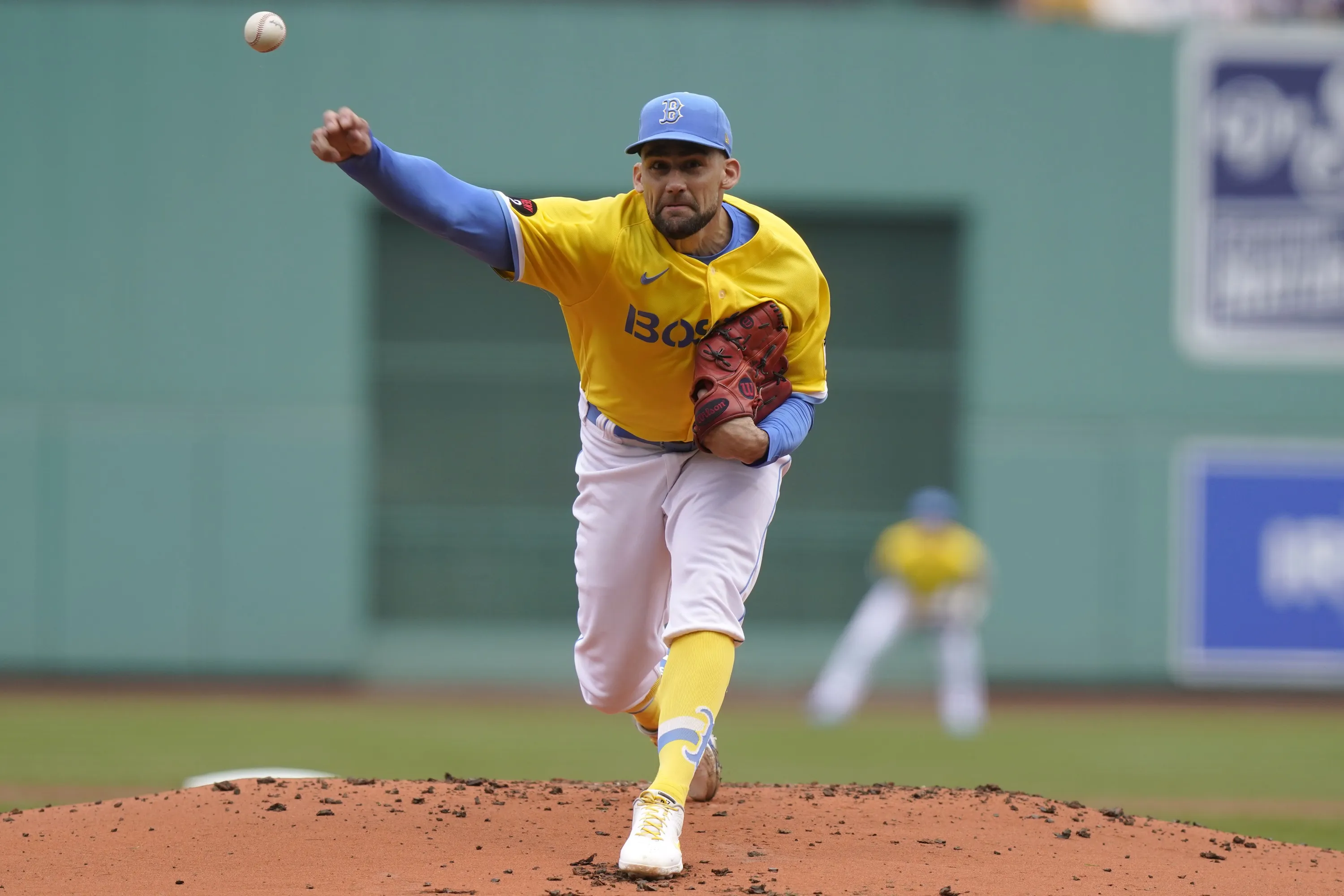 Boston Red Sox pitcher Nathan Eovaldi throws against a Baltimore Orioles player in the first inning of a baseball game, Thursday, September 29, 2022, in Boston. (Photo by Steven Senne/AP Photo)