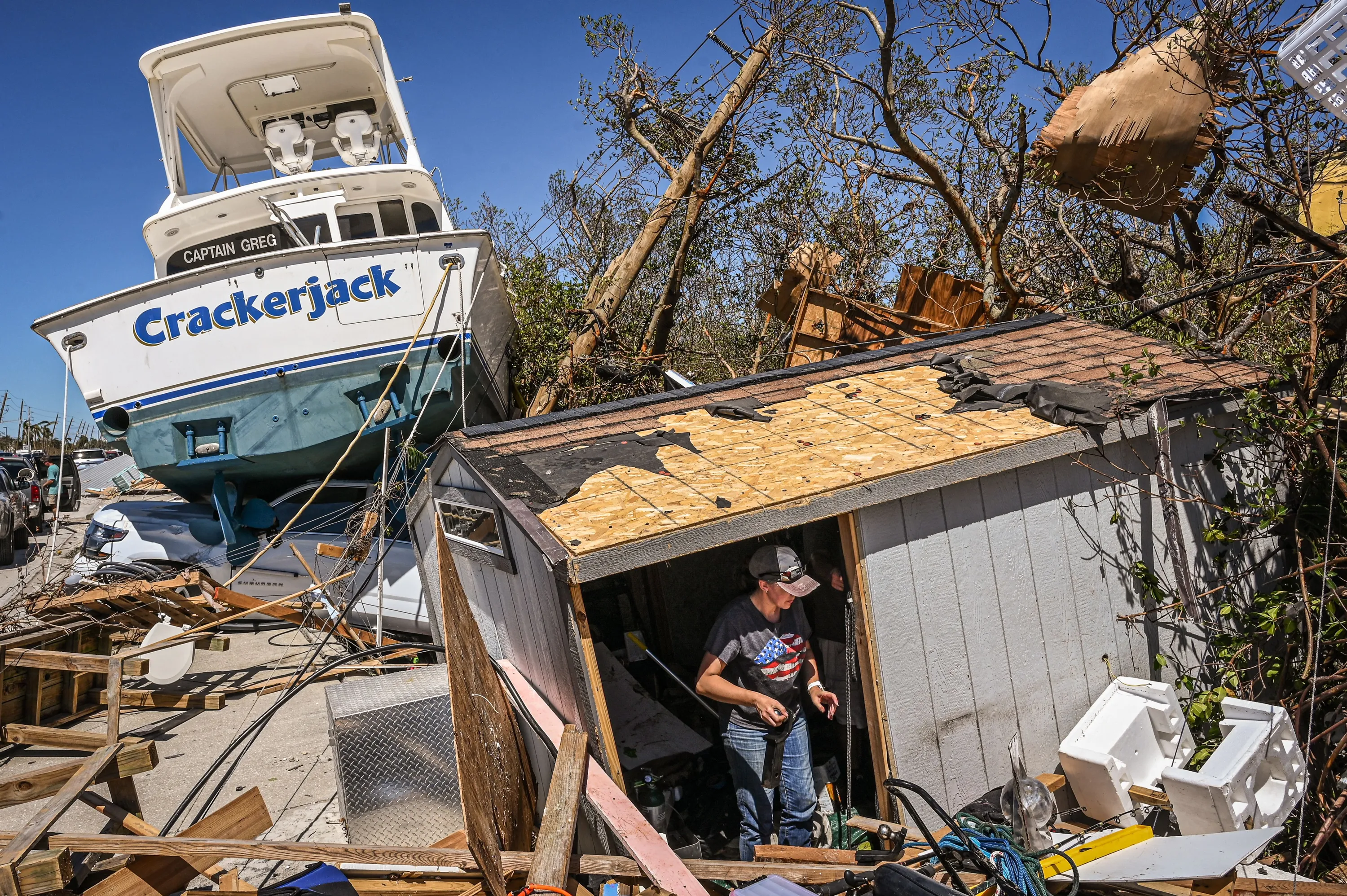 People clear debris in the aftermath of Hurricane Ian in Fort Myers Beach, Florida on September 30, 2022. Forecasters expect Hurricane Ian to cause life-threatening storm surges in the Carolinas on Friday after unleashing devastation in Florida, where it left a yet unknown number of dead in its wake. After weakening across Florida, Ian regained its Category 1 status in the Atlantic Ocean and was headed toward the Carolinas, the US National Hurricane Center said Friday. (Photo by Giorgio Viera/AFP Photo)