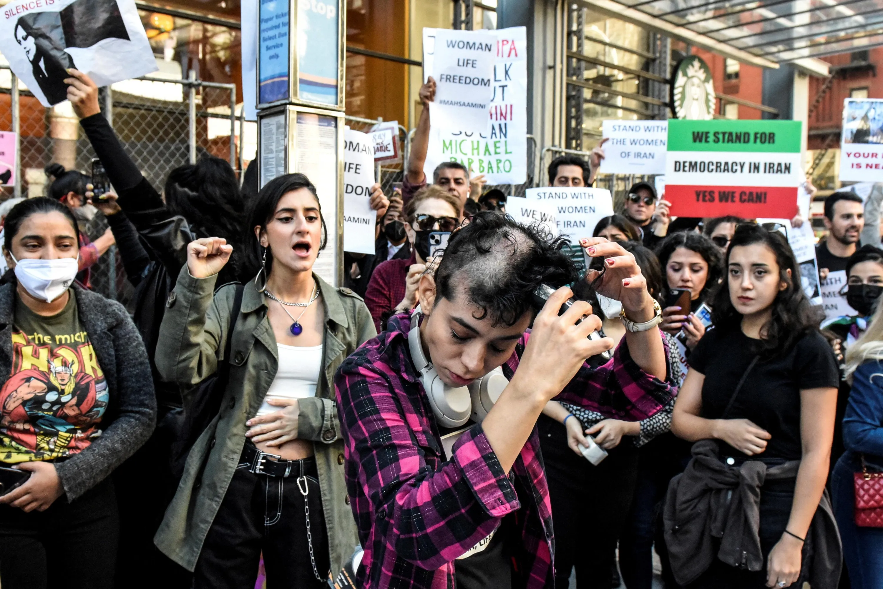 A person shaves their head during a protest against the Islamic regime of Iran and the death of Mahsa Amini in New York City, New York, U.S., September 27, 2022. (Photo by Stephanie Keith/Reuters)