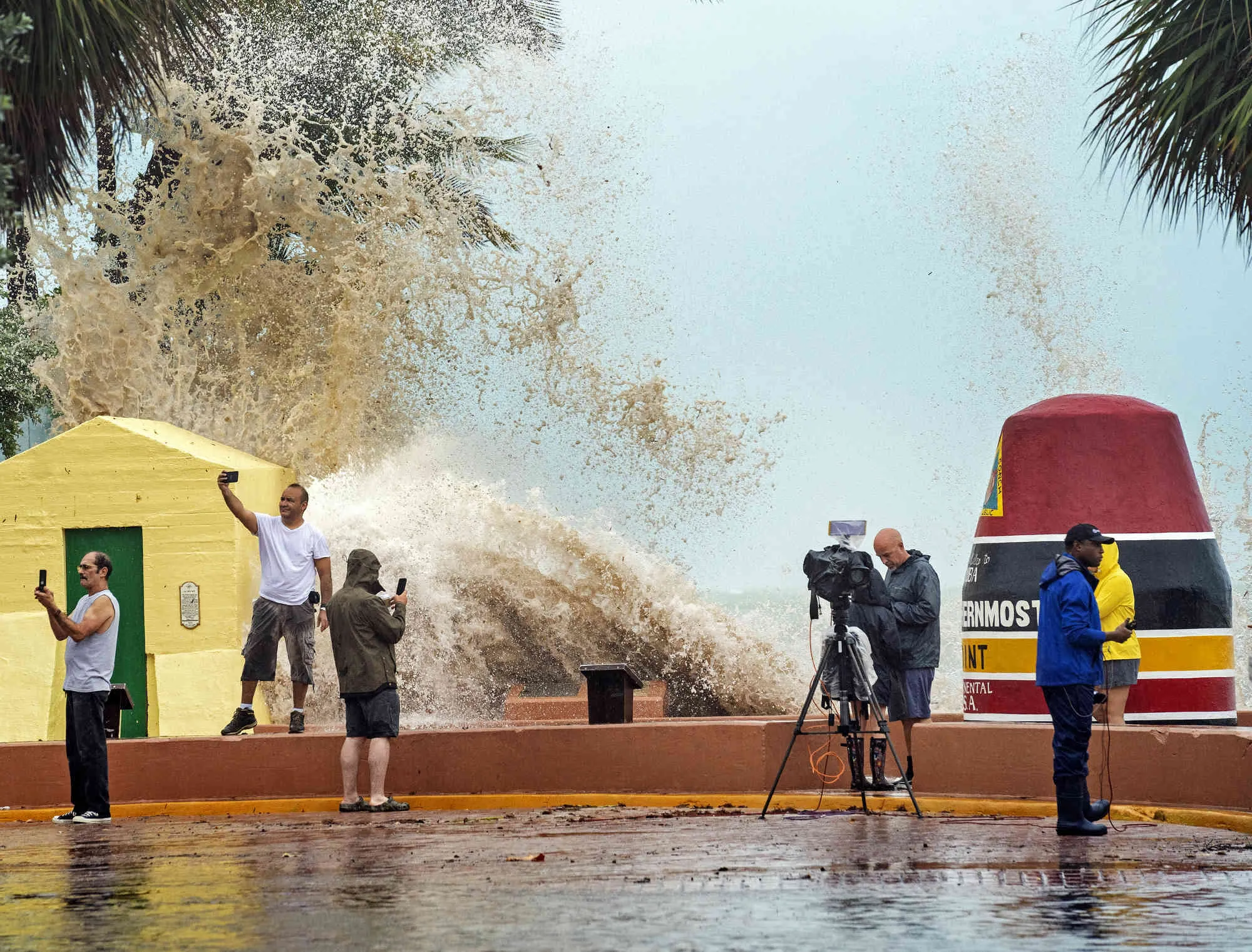 News crews, tourists and local residents take images as high waves from Hurricane Ian crash into the seawall at the Southernmost Point buoy, Tuesday, September 27, 2022, in Key West, Fla. Ian was forecast to strengthen even more over warm Gulf of Mexico waters, reaching top winds of 140 mph (225 kmh) as it approaches the Florida’s southwest coast. (Photo by Rob O'Neal/The Key West Citizen via AP Photo)