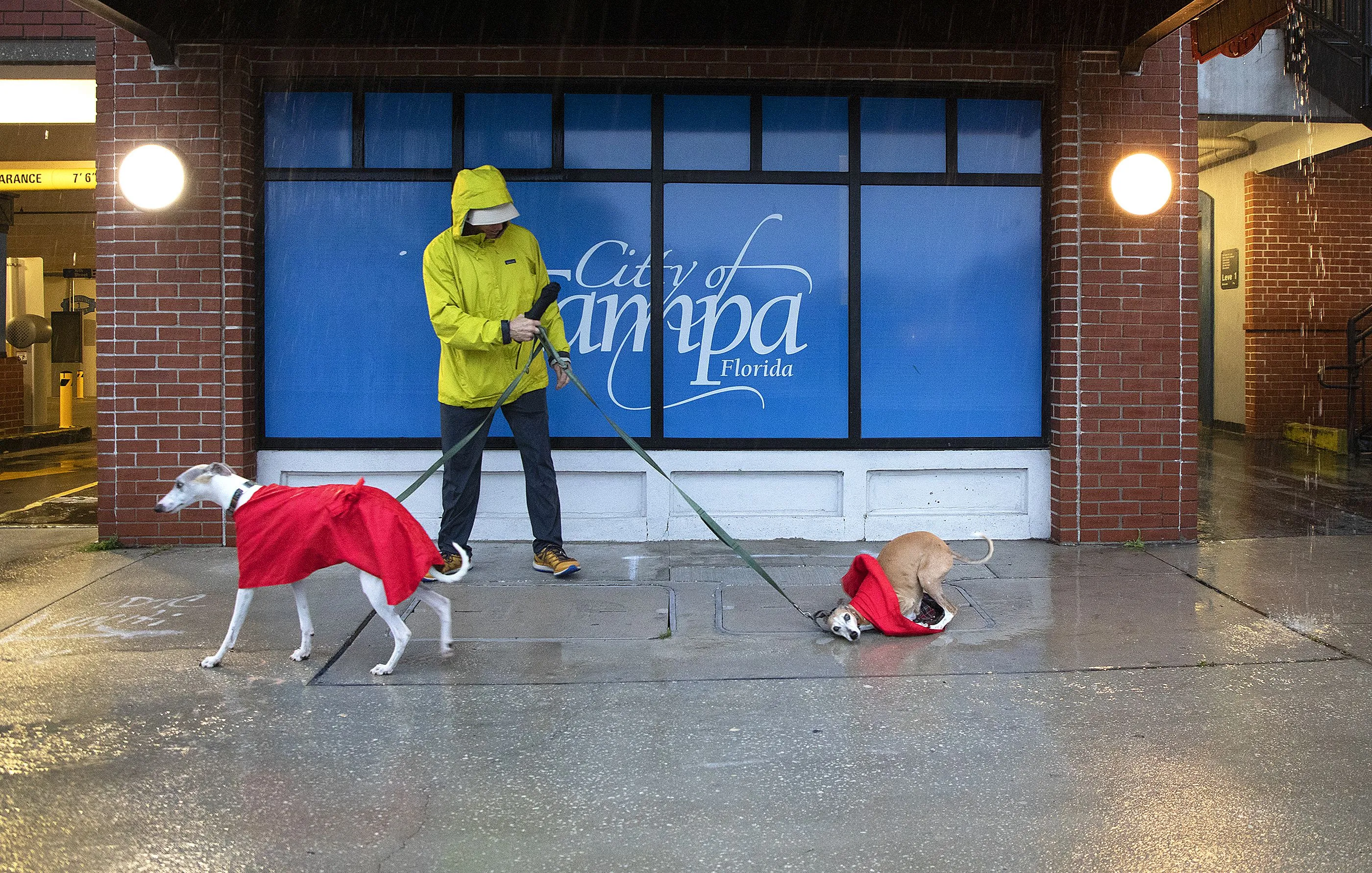 Bill Bravato’s dog Ryder gets tangled in her rain jacket while Bravato hurried a walk with Ryder and Togo while the outer bands of Hurricane Ian arrived in Tampa, FL, Wednesday morning, September 28, 2022. Bravato evacuated from Davis Island the night before to seek refuge in a nearby hotel. (Photo by Ted Richardson/The Washington Post)