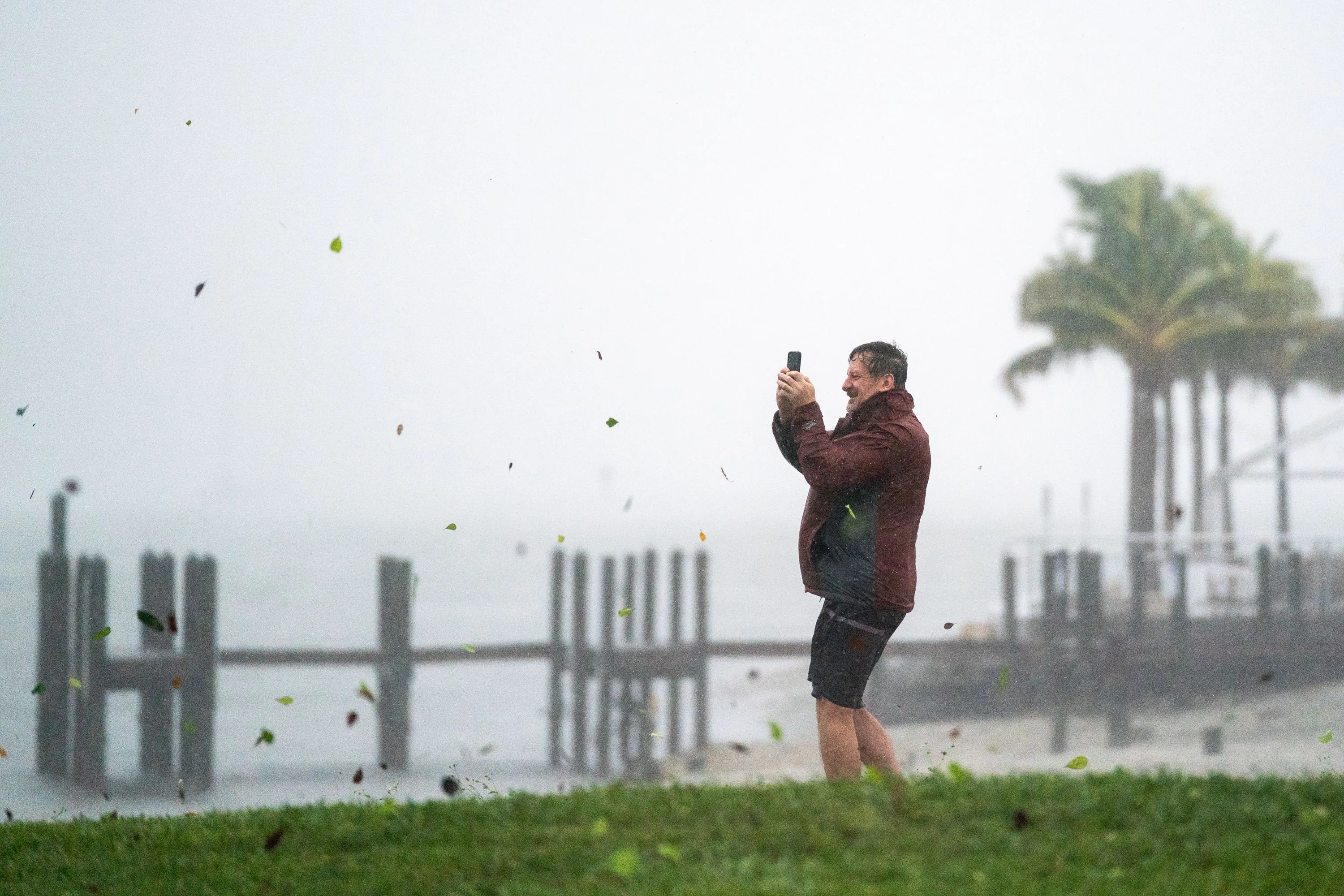Peter Currin documents the weather at Sarasota Bay as a gust of wind carries leaves and debris while Hurricane Ian approaches on September 28, 2022 in Sarasota, Florida. Forecasts call for the storm to make landfall in the area on Wednesday as a likely Category 4 hurricane. (Photo by Sean Rayford/Getty Images)