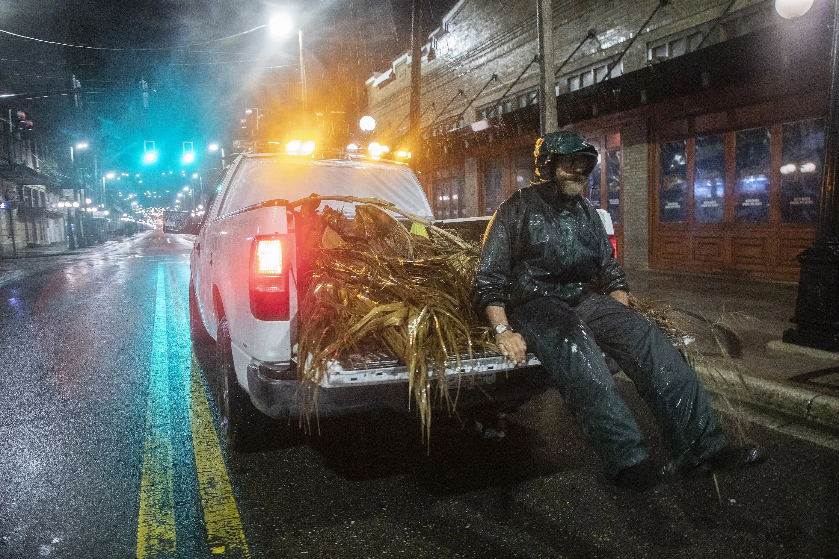 Lew Hendrix collects palm branches blown down by the outer bands of Hurricane Ian in the Ybor City neighborhood of Tampa, FL, early Wednesday morning, September 28, 2022. (Photo by Ted Richardson/The Washington Post)