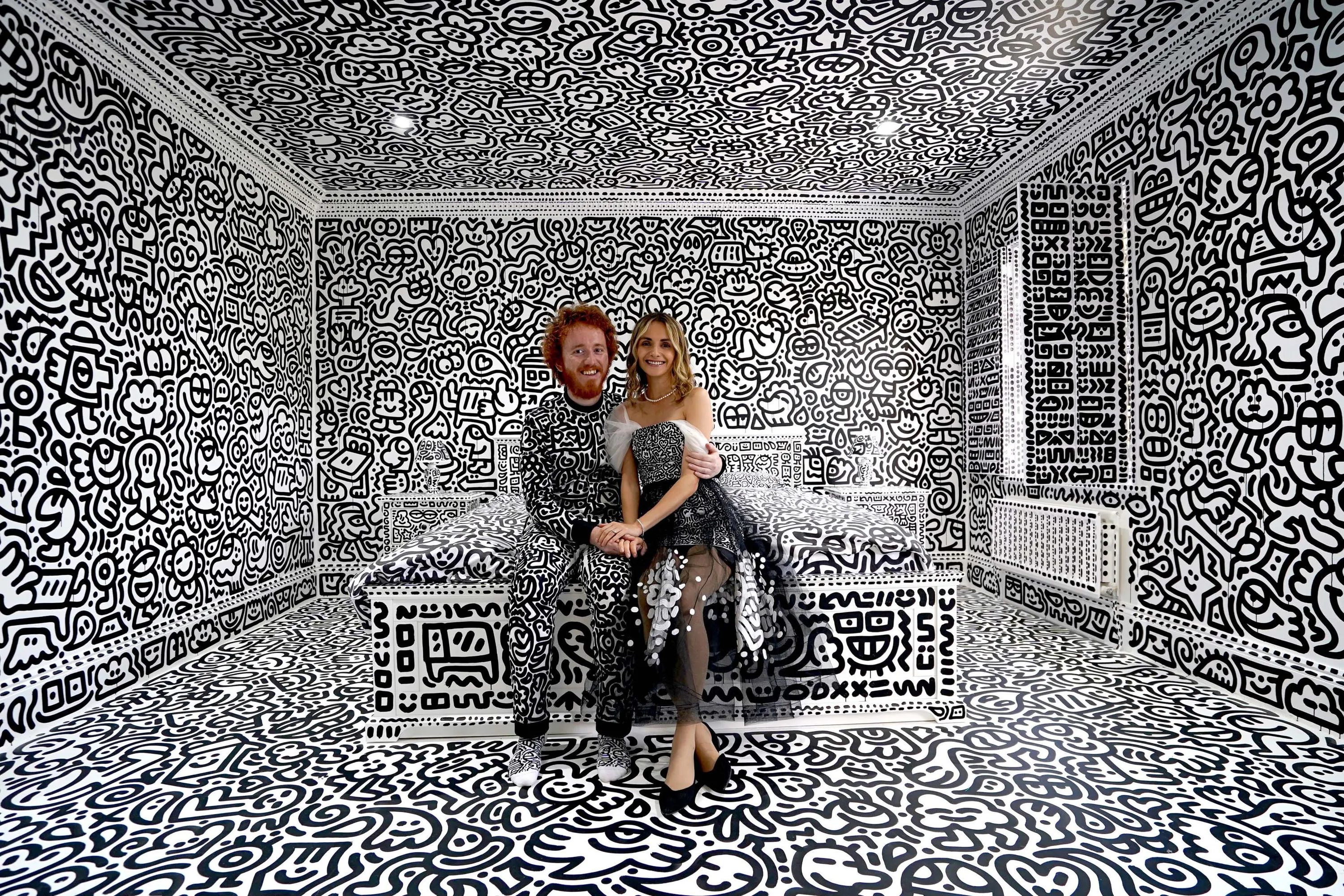 British artist Sam Cox, aka Mr Doodle, with his wife Alena, reveals on Monday, October 3, 2022 the Doodle House, a twelve-room mansion at Tenterden, in Kent, which has been covered, inside and out in the artist's trademark monochrome, cartoonish hand-drawn doodles. (Photo by Gareth Fuller/PA Images via Getty Images)