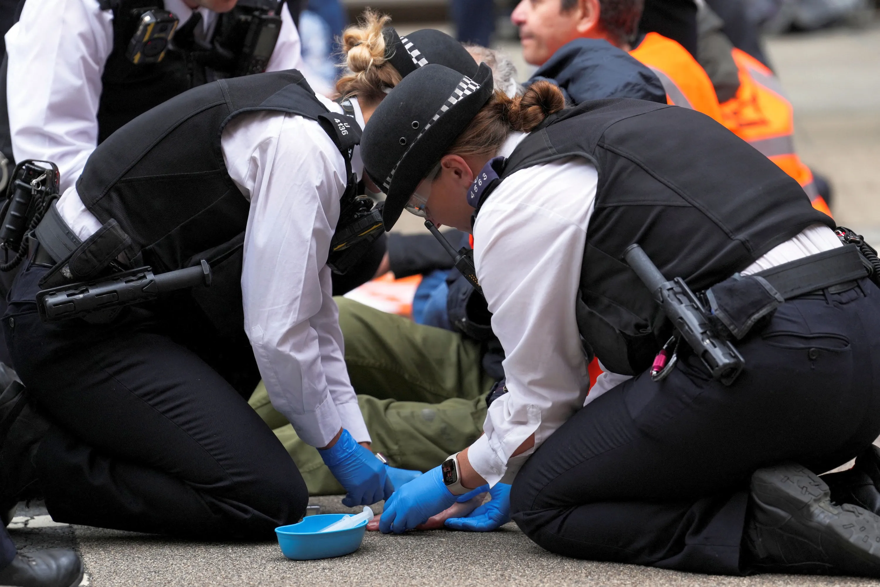 Police officers unglue Just Stop Oil activists who had glued themselves to the ground during a protest, in London, Britain on October 5, 2022. (Photo by Maja Smiejkowska/Reuters)
