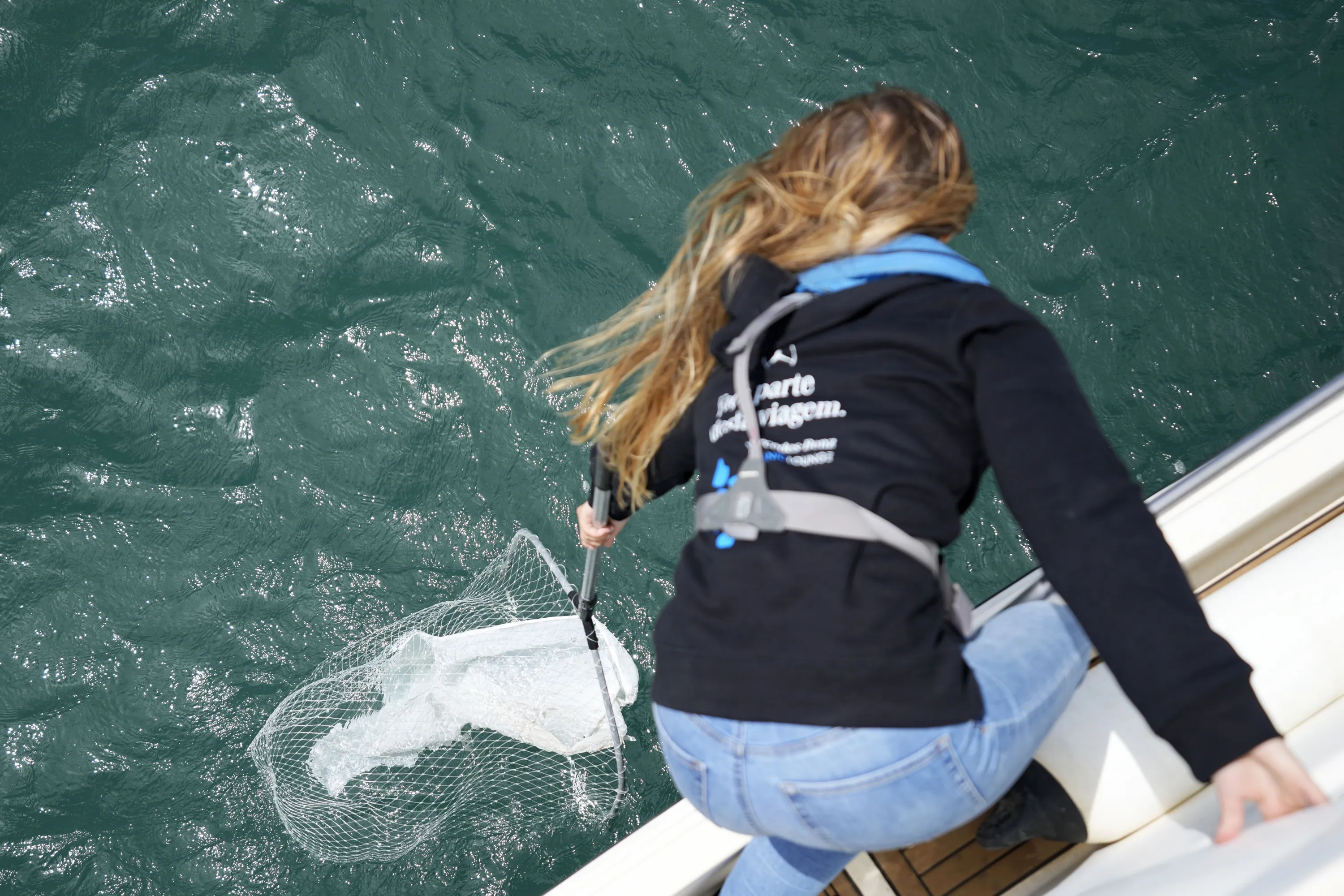 Marine biologist Catarina Pereira catches plastic floating on the Tagus River during a boat trip to watch dolphins at the mouth of the Tagus river in Lisbon, Friday, June 24, 2022. Starting Monday the United Nations is holding its five-day Oceans Conference in Lisbon hoping to bring fresh momentum for efforts to find an international agreement on protecting the world's oceans. (Photo by Armando Franca/AP Photo)