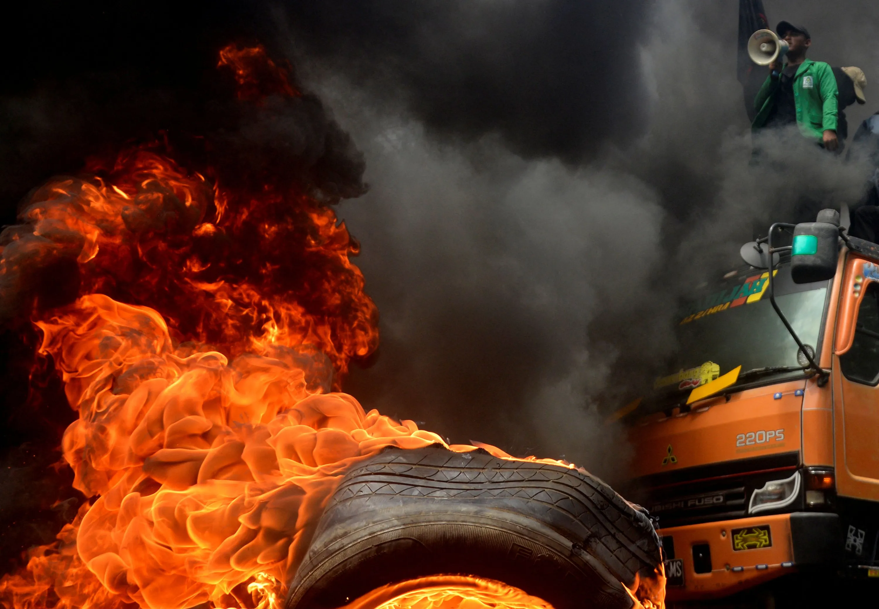 A university student takes part in a protest against the government after a rise in fuel prices, in South Sulawesi, Makassar, Indonesia on September 5, 2022. (Photo by Abriawan Abhe/Antara Foto/Reuters)