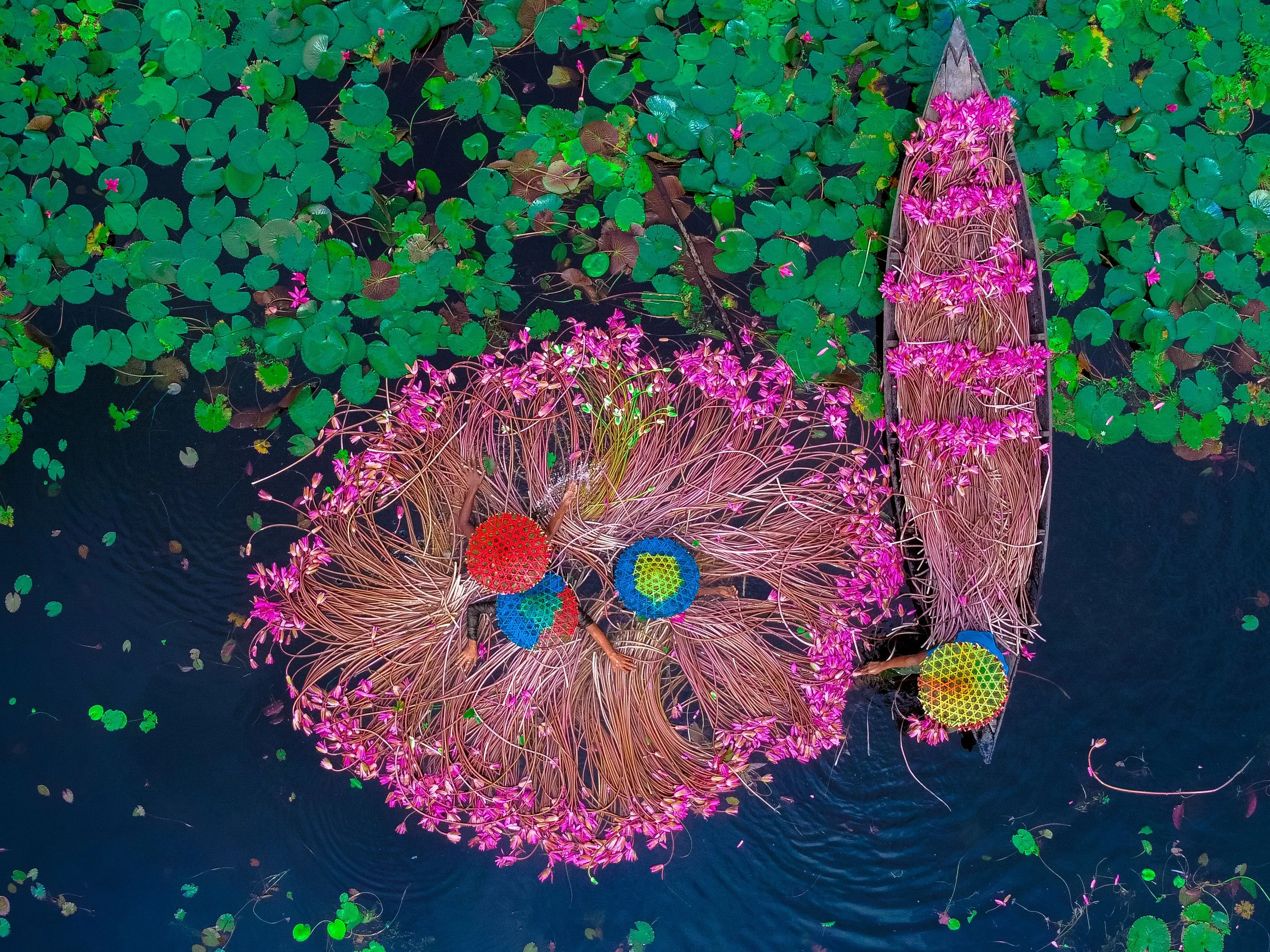 Farmers are seen floating through an over 40 square kilometers canal and collecting the Water Lilies in Satla Union, Barishal Division in Bangladesh on August 10, 2022. Workers are seen working from very early in the morning from 6-8 am in the canal wearing handmade Head caps to protect their head and body for the tremendous heat of the sun. The farmers would sell the delicate bright pink blooms at Local market. Pink lilies and green lily pads cover the over 10,000-acre canal and wetlands area in Barishal Division, Bangladesh. Every flower is carefully hand-picked and collected inside the farmers' little wooden boat. The flowers only bloom at a specific time during of seasonal flood starting from August to November. (Photo by Mustasinur Rahman Alvi/Rex Features/Shutterstock)