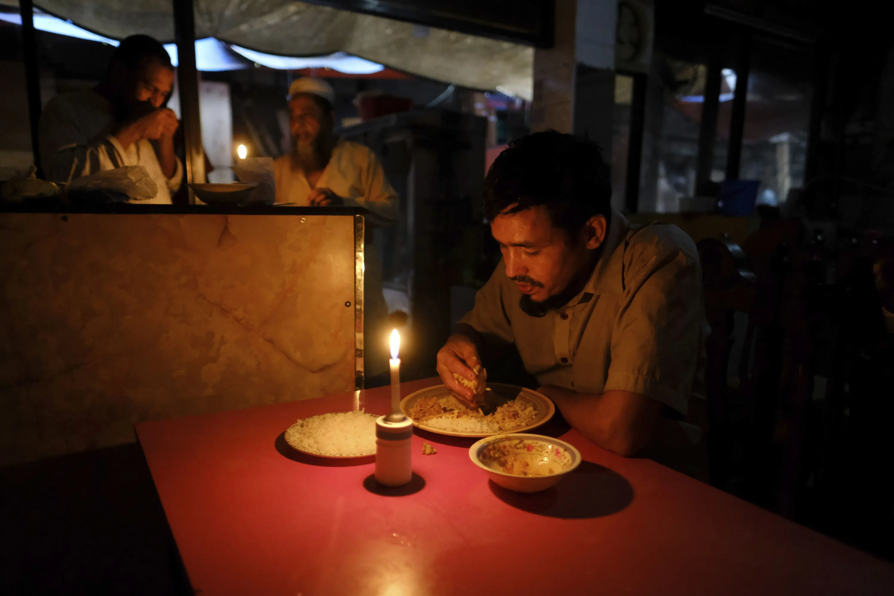 A person eats in a restaurant under candle lights during a power failure in Dhaka, Bangladesh. October 4, 2022. A failure in Bangladesh's national power supply grid plunged most of the country into a blackout on Tuesday, officials said. (Photo by Mahmud Hossain Opu/AP Photo)