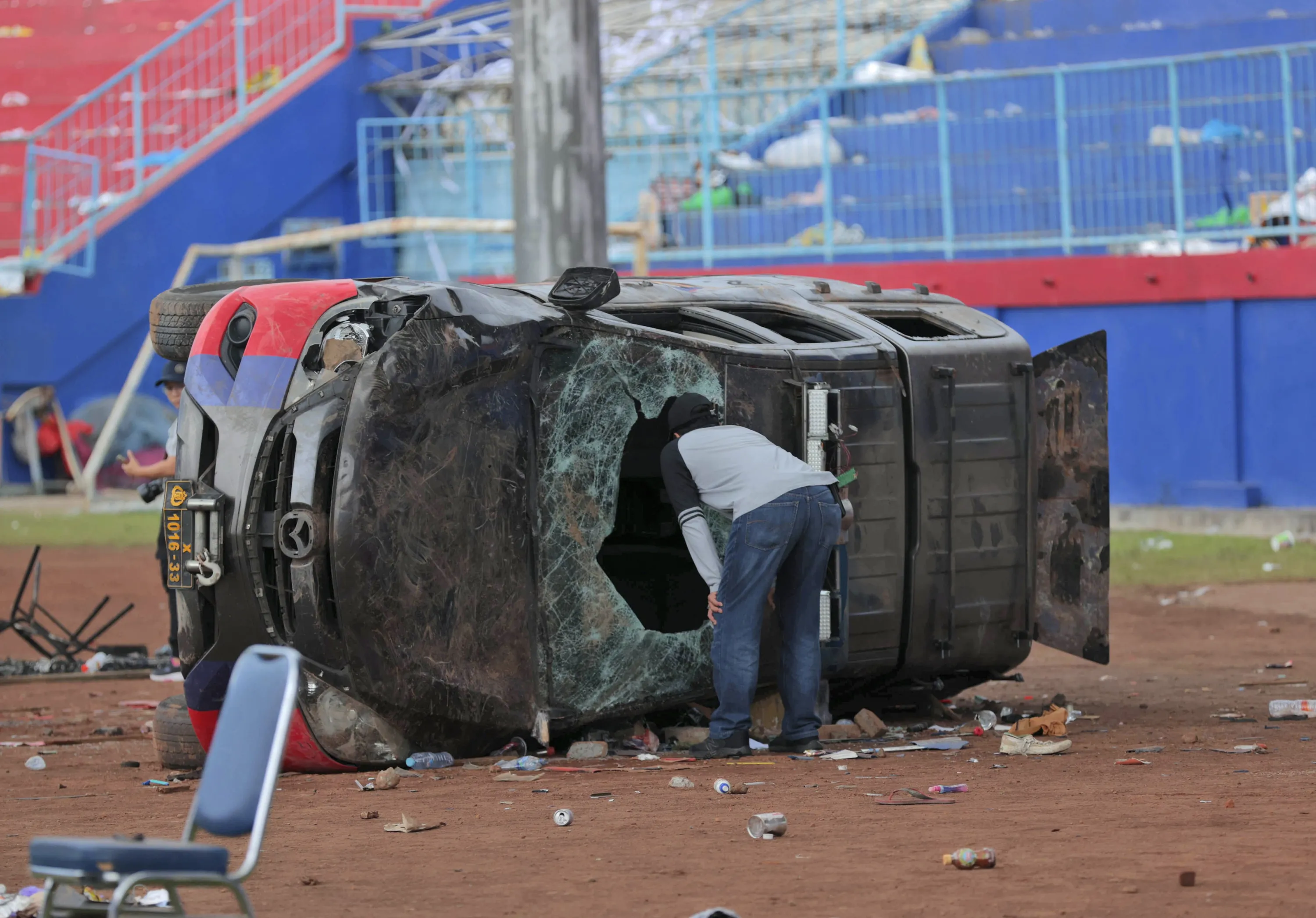 A plain-clothed police officer inspects a police car wrecked in soccer riots at Kanjuruhan Stadium in Malang, East Java, Indonesia, Sunday, October 2, 2022. Panic at an Indonesian soccer match Saturday left a number of people dead, most of whom were trampled to death after police fired tear gas to dispel the riots. (Photo by Trisnadi/AP Photo)