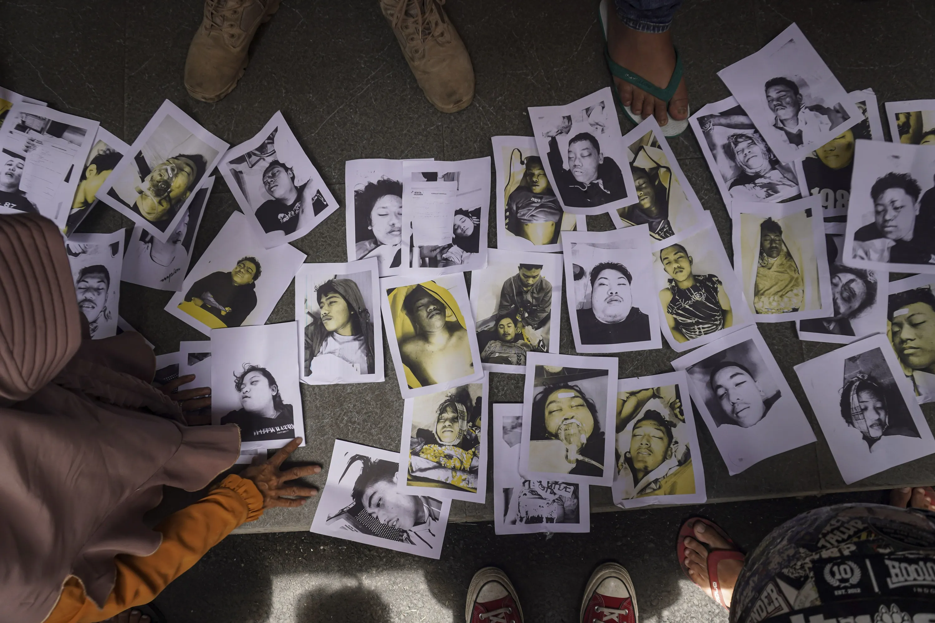 People looking for their relatives inspect photographs of soccer riot victims provided by volunteers to help them identify their family members in Malang, East Java, Indonesia, Sunday, October 2, 2022. (Photo by Dicky Bisinglasi/AP Photo)