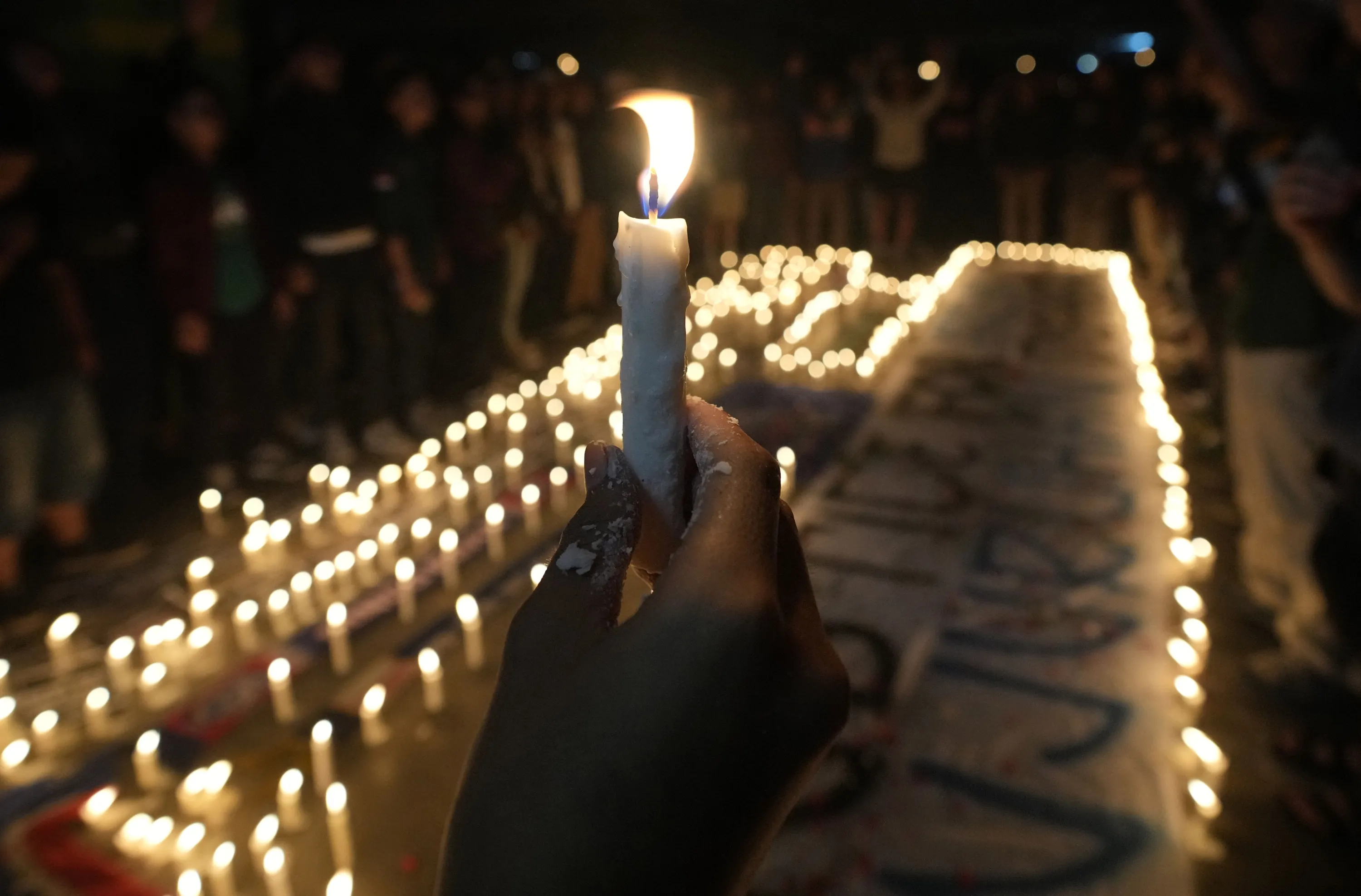 A man holds a candle during a candle light vigil for Arema FC Supporters who died following Saturday's soccer match stampede, at Patriot Stadium in Bekasi, Indonesia, Monday, October 3, 2022. Indonesian police said they were investigating over a dozen officers responsible for firing tear gas that set off a crush that killed a number of people at a soccer match as families and friends grieved Monday for the victims that included children. (Photo by Tatan Syuflana/AP Photo)