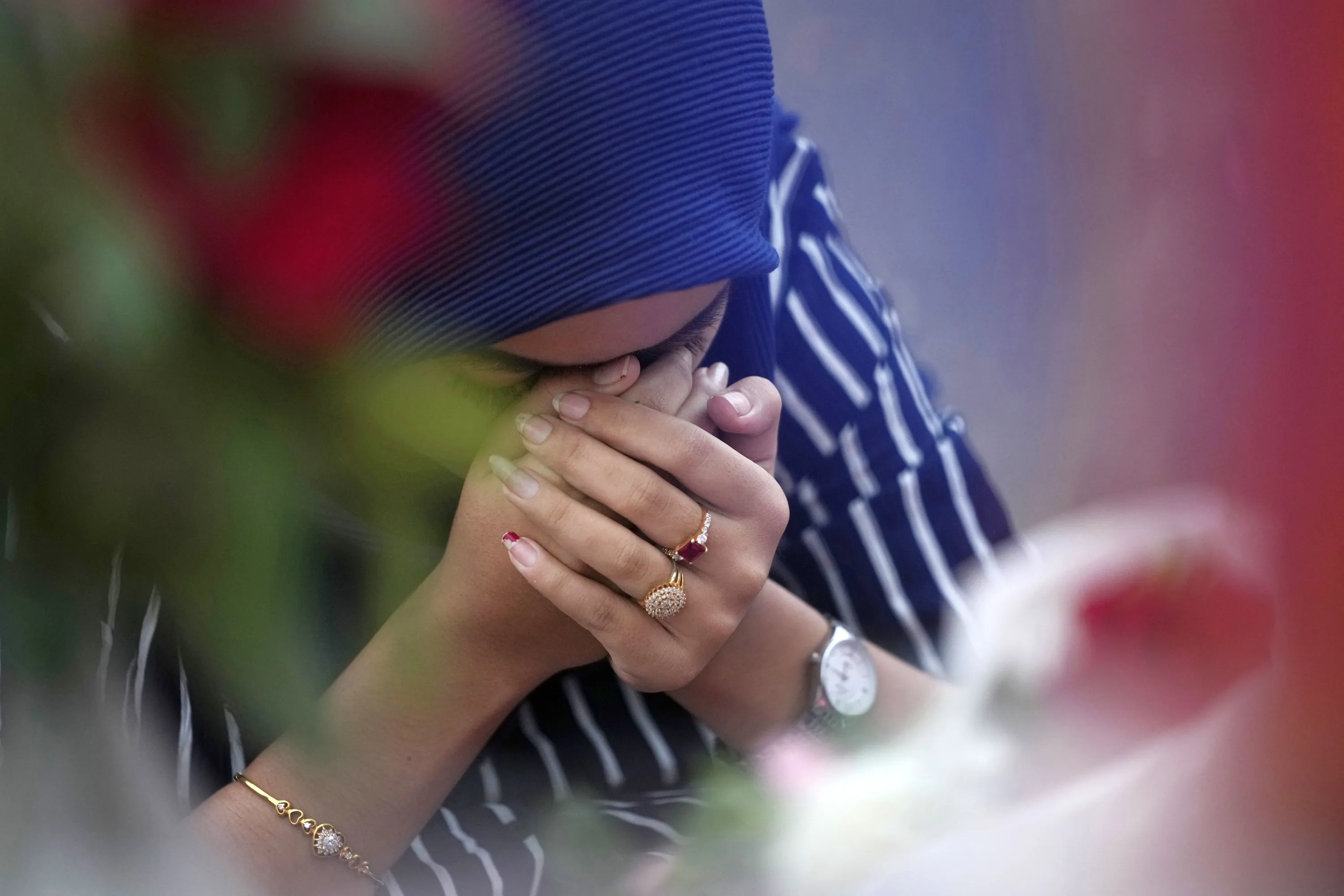 People pause to pray for the victims of Saturday's soccer match stampede outside the Kanjuruhan Stadium in Malang, Indonesia, Monday, October 3, 2022. (Photo by Achmad Ibrahim/AP Photo)