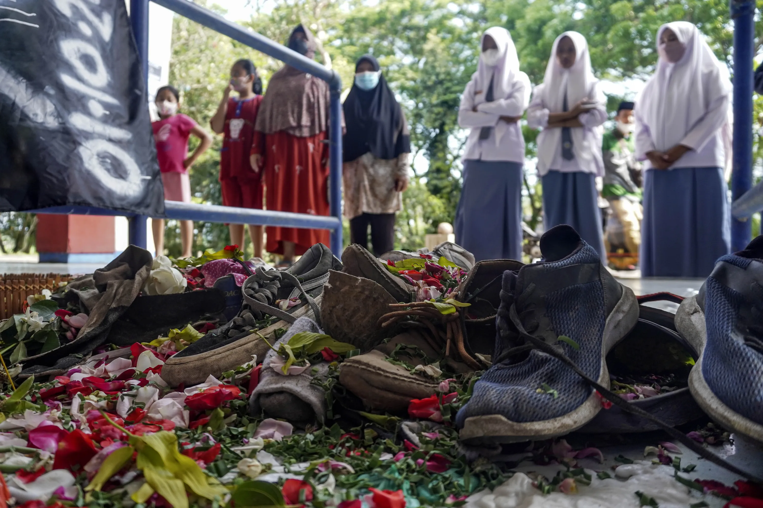 Victims' shoes left near one of the gates of Kanjuruhan Stadium, the site of Saturday's soccer stampede, are seen sprinkled with flowers in Malang, East Java, Indonesia, Tuesday, October 4, 2022. Police firing tear gas inside the stadium on Saturday in an attempt to stop violence after an Indonesian soccer match triggered a disastrous crush of fans making a panicked, chaotic run for the exits, leaving at more than 100 people dead, most of them trampled upon or suffocated. (Photo by Dicky Bisinglasi/AP Photo)