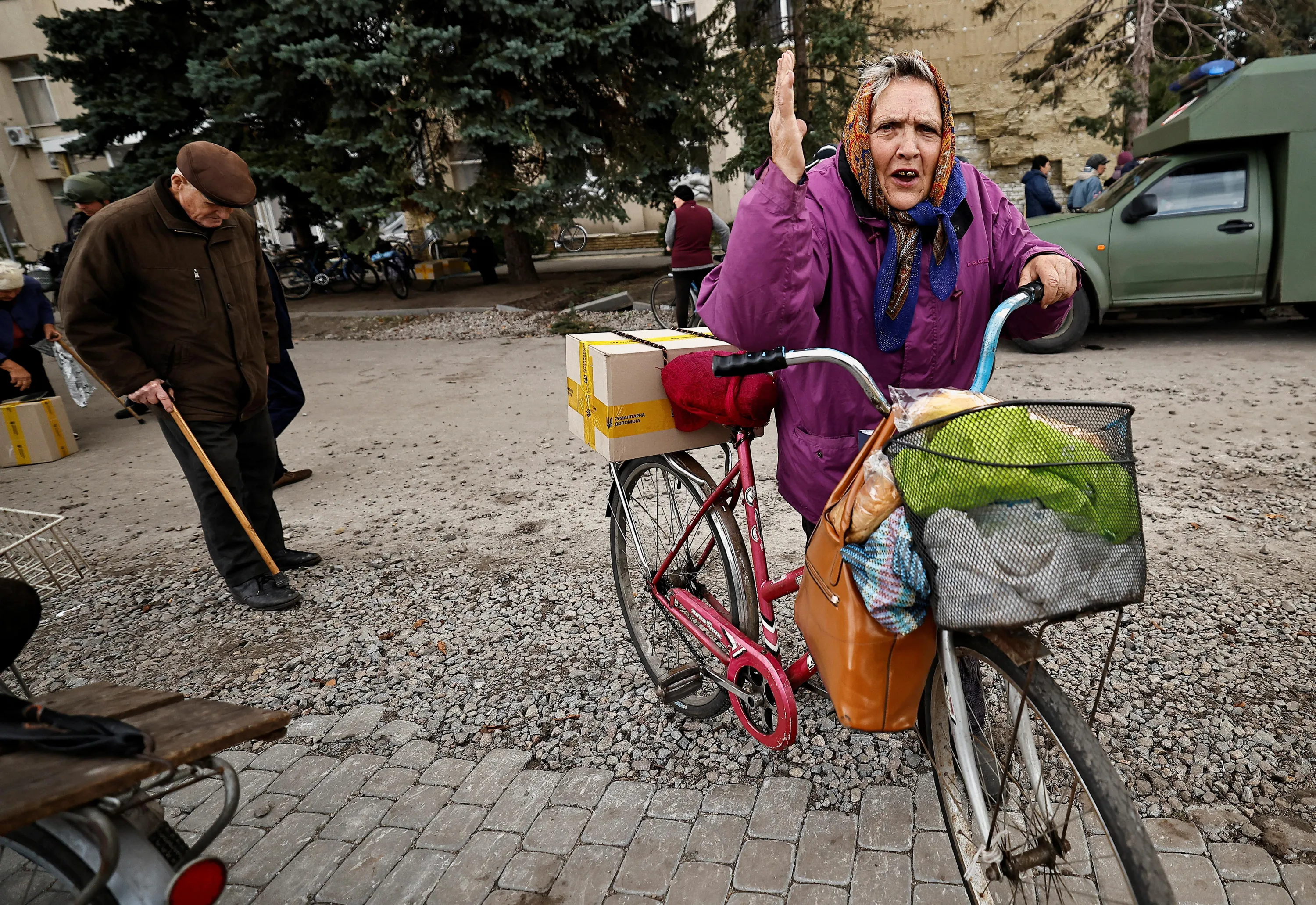 A local resident wheels her bicycle after she received humanitarian aid, amid Russia's invasion of Ukraine, in the recently liberated town of Lyman, Donetsk region, Ukraine on October 5, 2022. (Photo by Zohra Bensemra/Reuters)