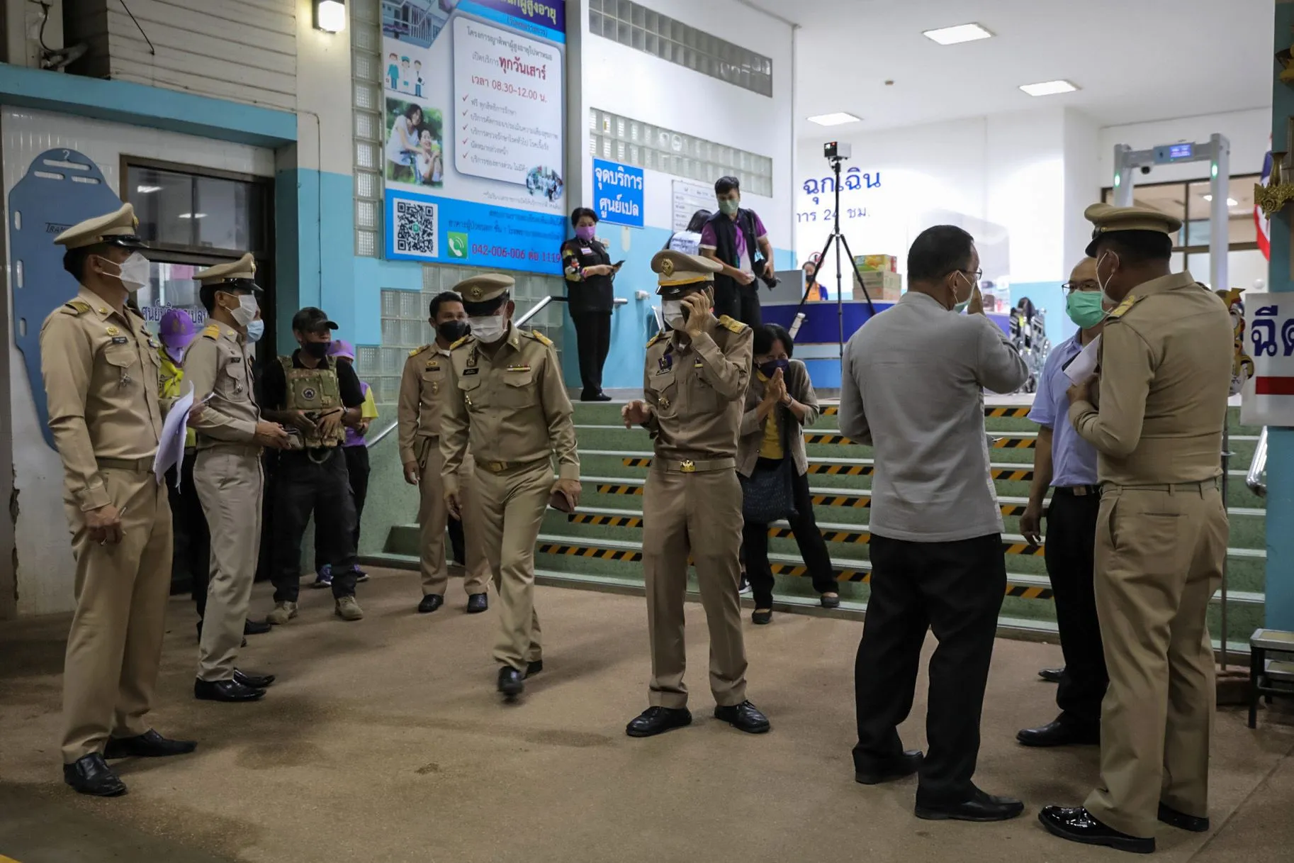 Police officers stand outside a hospital where the injured are being treated on October 06, 2022 after a shooting in Uthai Sawan subdistrict, Nong Bua Lamphu, Thailand. Thai police said that former police officer Panya Kamrab, 34, had killed at least 38 people, including 24 children – some as young as 2 – in a mass shooting and stabbing at Child Development Center Uthaisawan – a child care center in northeast Thailand. The assailant subsequently shot himself and his family, police said. The shooting comes two years after a disgruntled soldier killed 29 people in a shooting at a mall in 2020, and is the country's deadliest mass killing perpetrated by a lone gunman. (Photo by Lauren DeCicca/Getty Images)