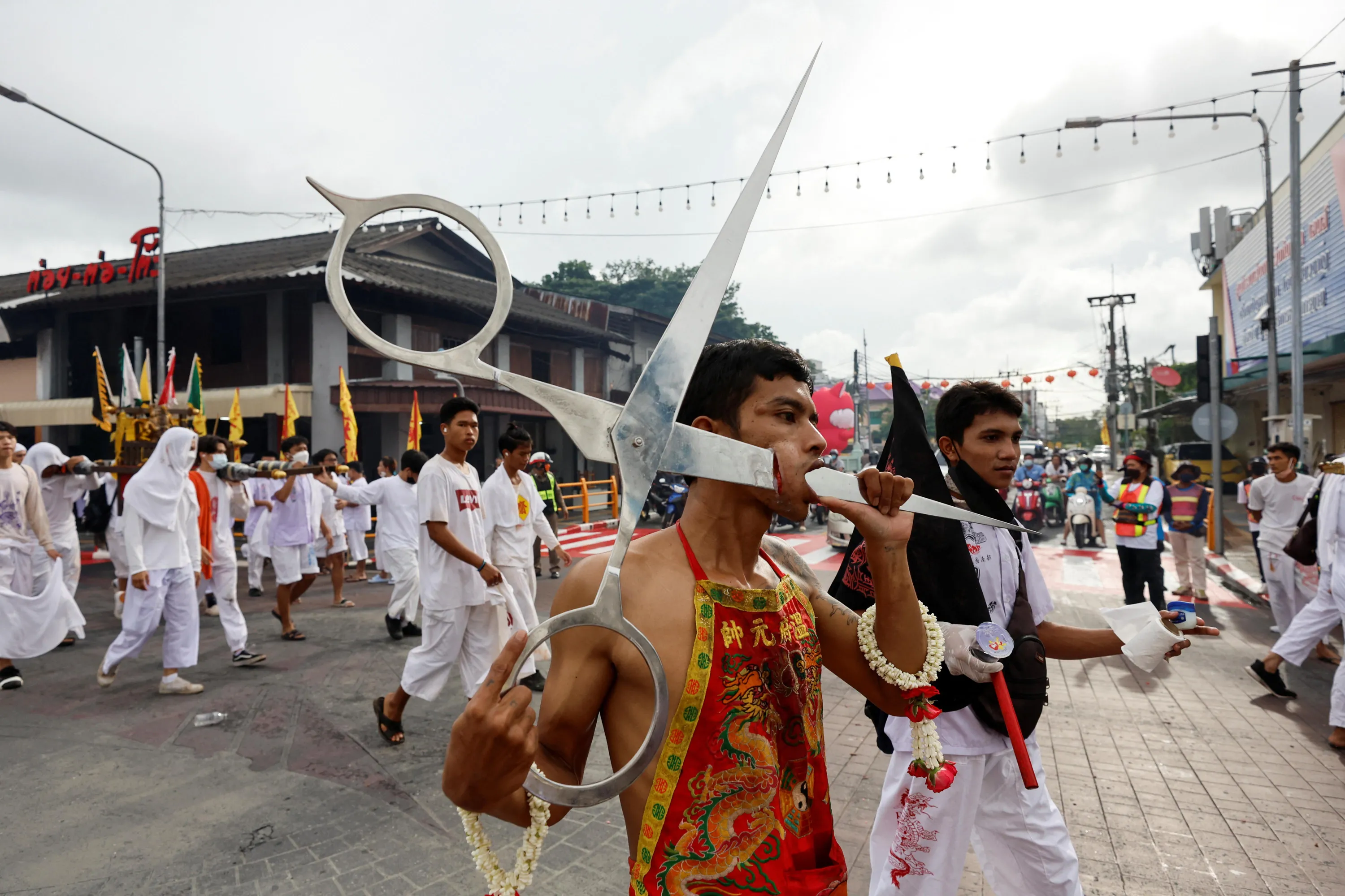 People participate in the annual vegetarian festival, observed by Taoist devotees from the Thai-Chinese community in the ninth lunar month of the Chinese calendar, in Phuket, Thailand on September 29, 2022. (Photo by Jorge Silva/Reuters)